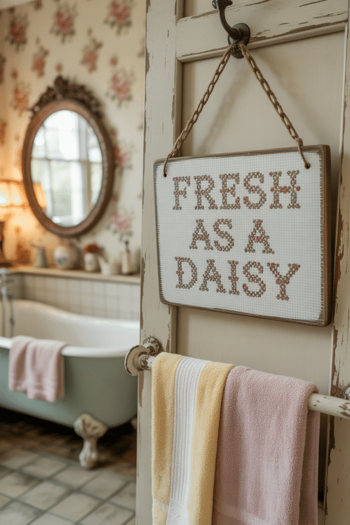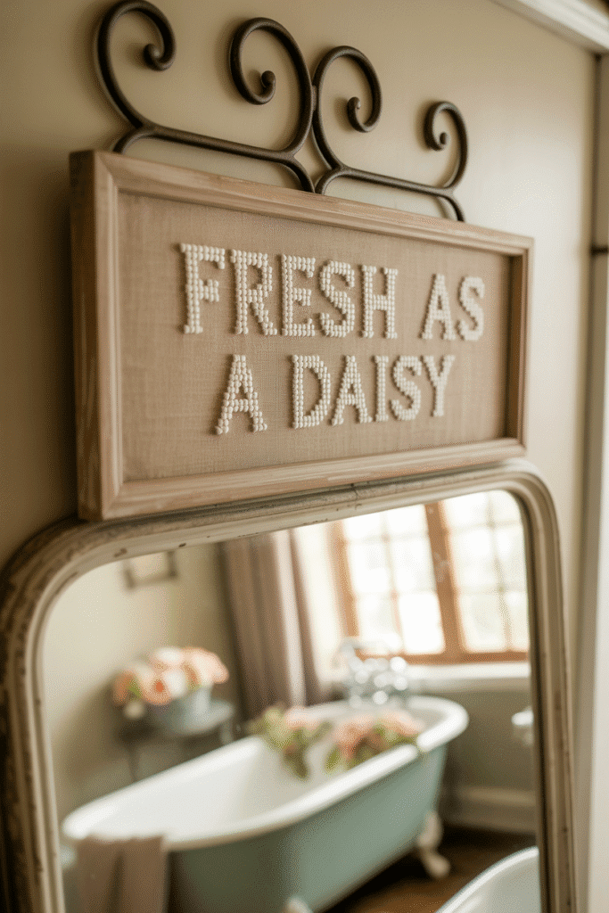 Design a wooden sign that mimics the look of classic cross stitch patterns. Use playful phrases like Please Remain Seated or Fresh as a Daisy. It adds a touch of nostalgia and hand crafted charm to the space, especially fitting for cozy or vintage themed bathrooms.