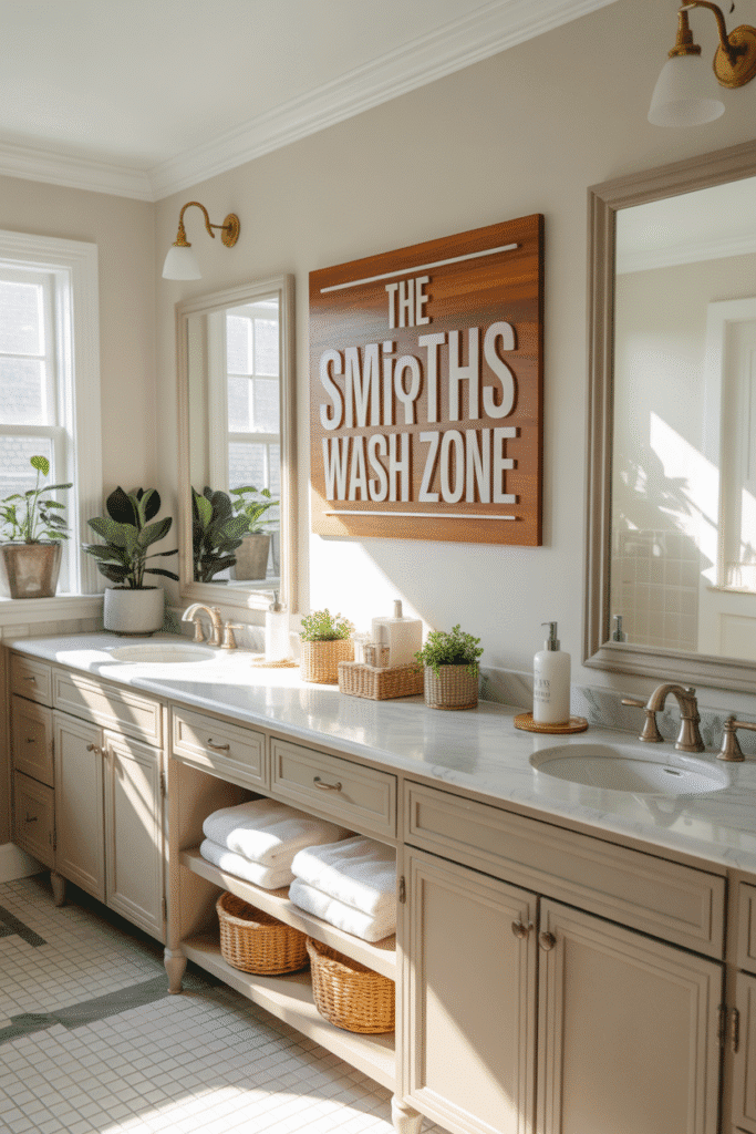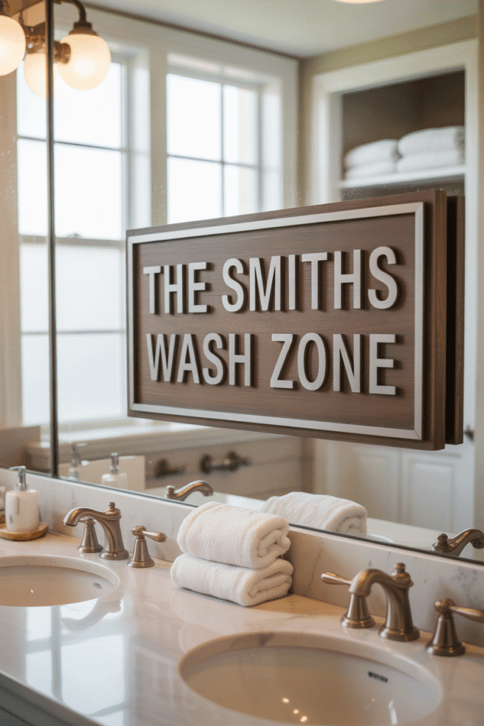 Craft a plaque with your family’s last name and a fun tagline like The Smiths Wash Zone or Soap Central Est Twenty Twenty Two. It personalizes your space and gives guests a smile without trying too hard. It works especially well in larger households.