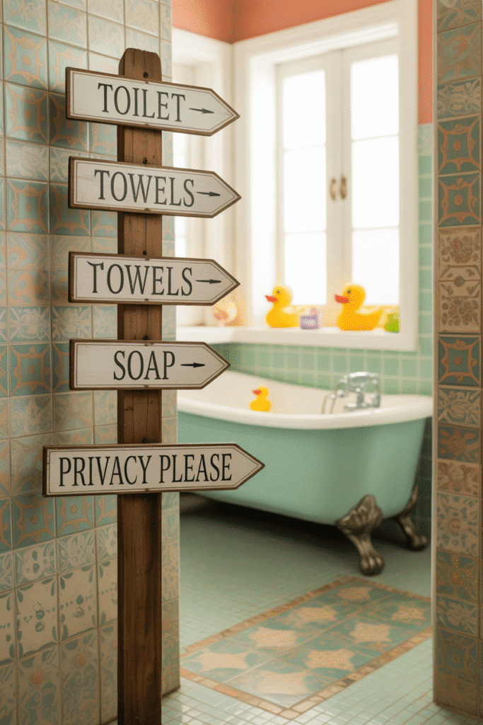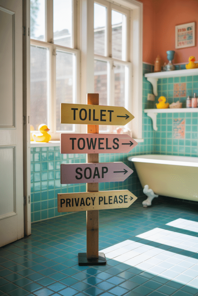 Create a vertical wooden post with small arrow signs pointing in different directions labeled Toilet Towels Soap and Privacy Please. It feels whimsical and serves as both art and a wayfinding tool. This is especially fun in large bathrooms or shared spaces.