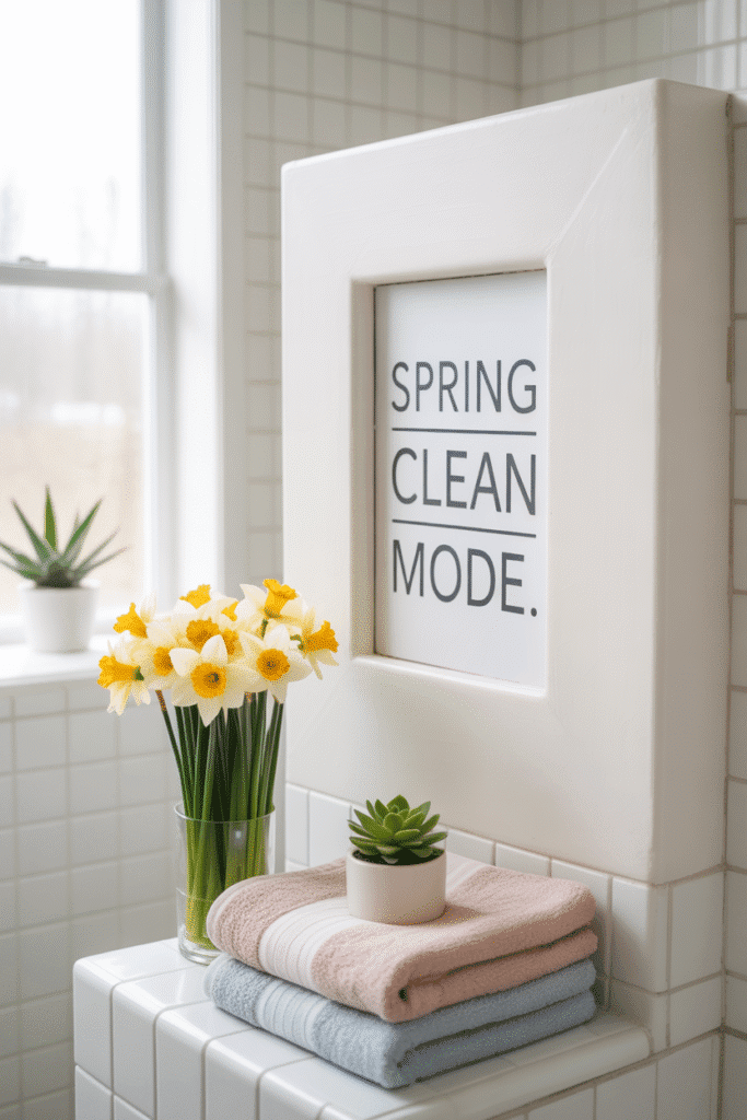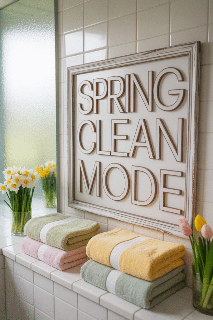 Hang one decorative frame and rotate printed inserts with seasonal messages. Use sayings like Spring Clean Mode or Sweater Weather Soak for fall. It keeps the bathroom feeling fresh all year without needing a total makeover and adds a fun ritual to your decor routine.