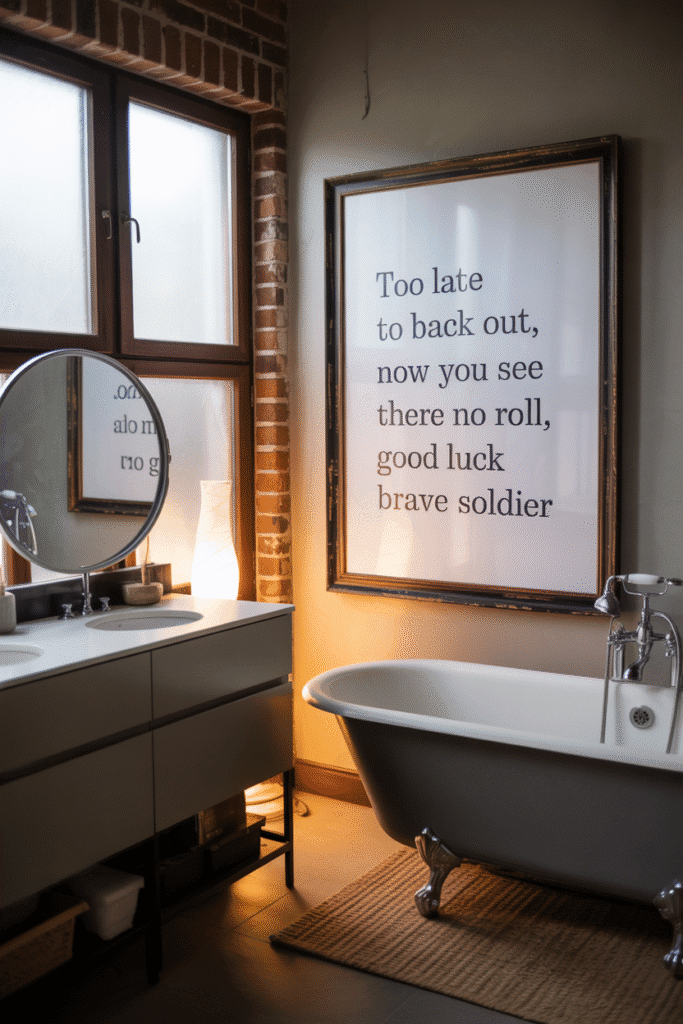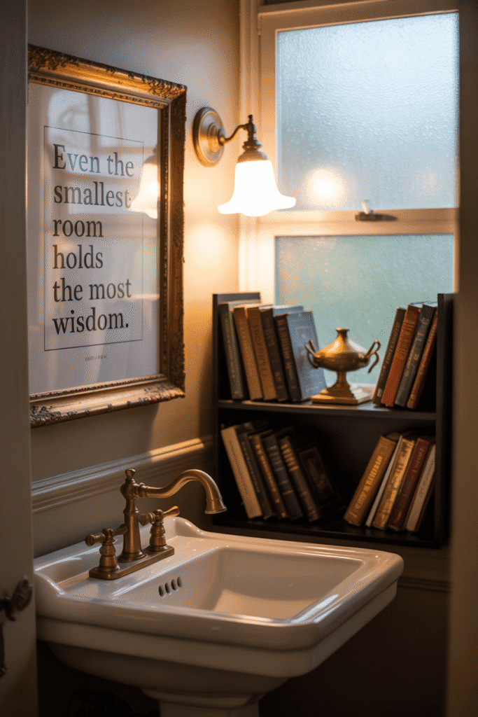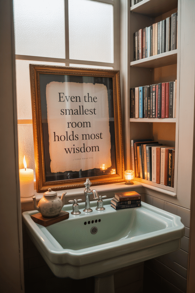 Print and frame a quote from a favorite book that fits the bathroom vibe. Something like Even the Smallest Room Holds the Most Wisdom adds character and literary charm. Ideal for readers who want their decor to reflect their interests in a subtle and smart way.