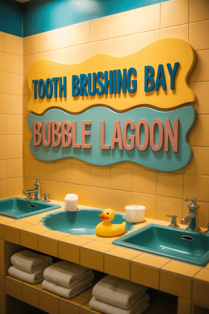 Make a colorful sign with playful sections labeled Tooth Brushing Bay Bubble Lagoon and Towel Town. Use bright colors and cartoonish fonts to make hygiene routines more engaging for children. It turns a chore into a fun experience and encourages independence.