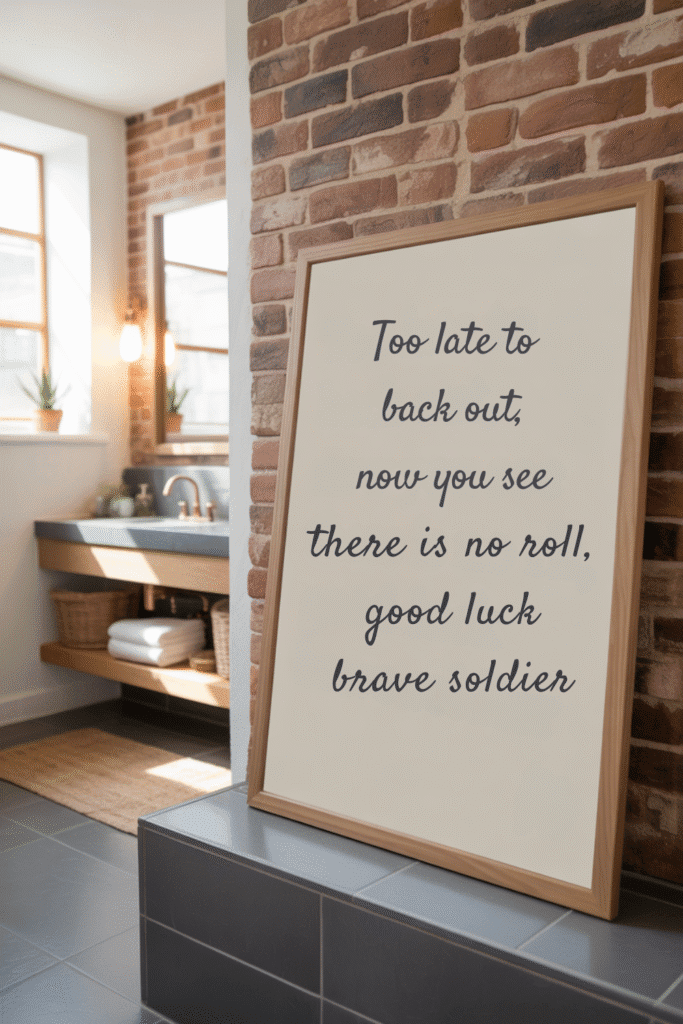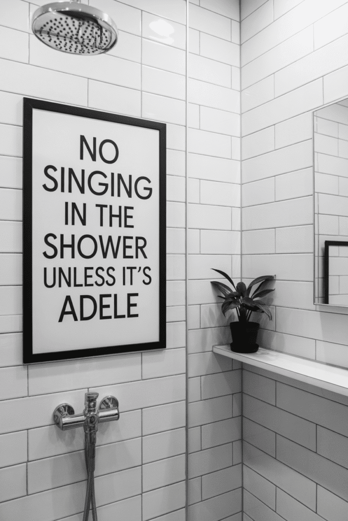 Go with a monochrome sign that says something sharp like No Singing in the Shower Unless It’s Adele. Use clean typography and a simple frame. It strikes the perfect balance between sleek design and offbeat humor, making your bathroom both stylish and unforgettable.