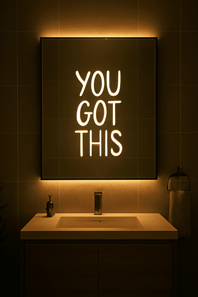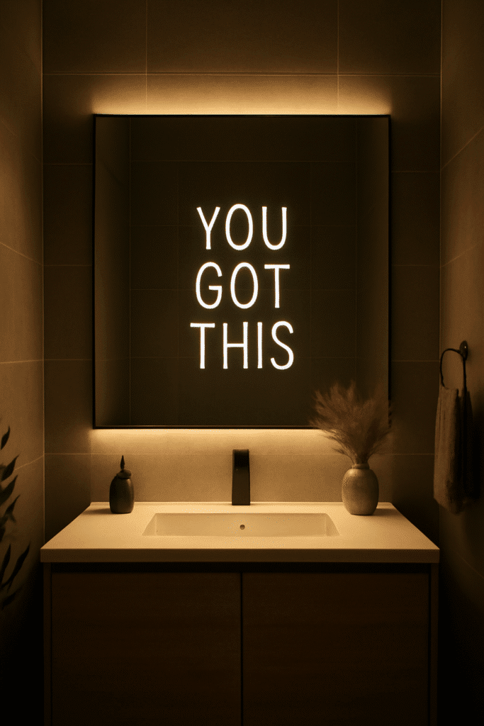 Etch or apply a vinyl decal with a positive phrase like You Got This or You Are Glowing directly onto the mirror. It acts as a daily confidence booster without taking up wall space. The reflection amplifies the message, making it feel personal and intentional. Every glance becomes a subtle pep talk.