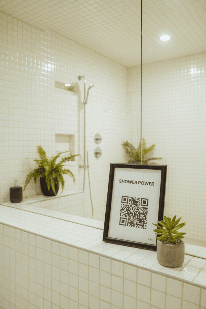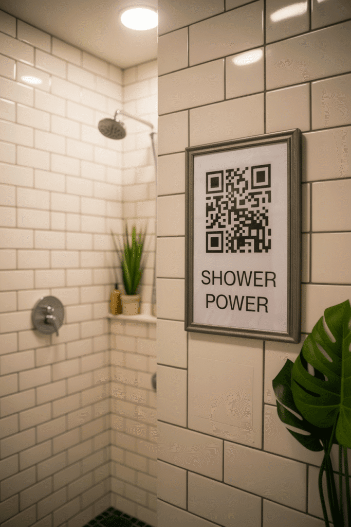 Mount a framed sign that includes a scannable QR code linked to a curated playlist. Label it with something fun like Shower Power or Bath Beats. It adds an interactive and unexpected tech twist to your bathroom decor. Your guests will love discovering it, and it makes morning routines more enjoyable.