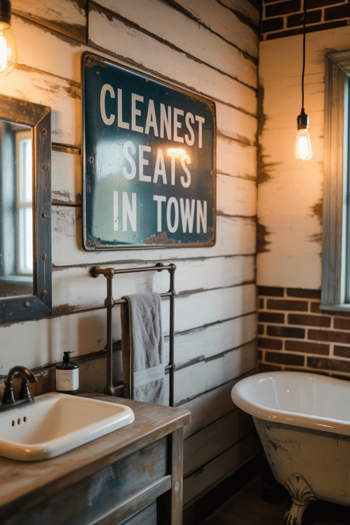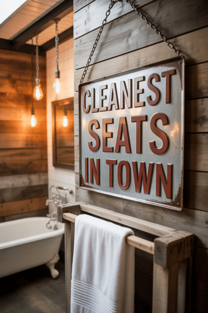 Channel vintage rest stop vibes with a wooden or metal sign that mimics old roadside bathroom signage. Include phrases like Cleanest Seats in Town or Hot Water Included. This idea pairs perfectly with industrial or farmhouse themes and adds a nostalgic element to modern bathrooms.