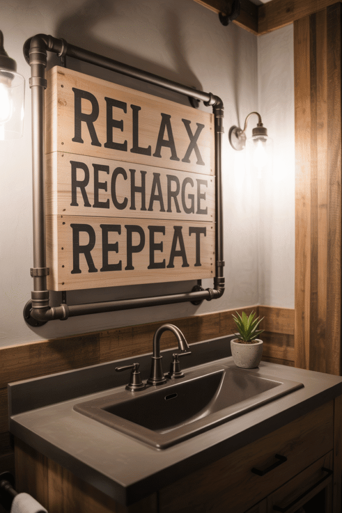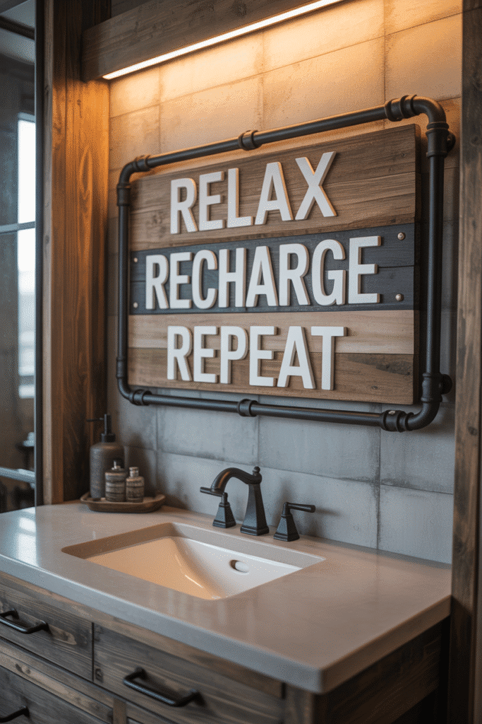 Use reclaimed wood paired with black iron pipes to build a sturdy, rustic frame. Add a message like Relax Recharge Repeat in bold block letters. This piece fits seamlessly into minimalist or masculine decor themes and makes a strong visual statement without being overwhelming.