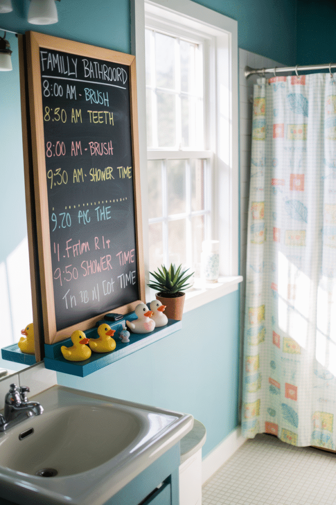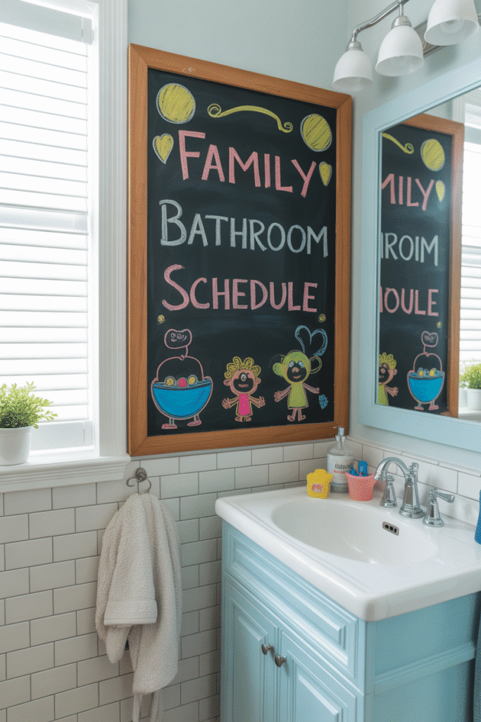 Install a chalkboard or dry erase board as a functional sign that tracks each family member’s morning routine. Add names and time slots in colorful marker. It keeps everyone organized while doubling as a rotating art piece. Ideal for busy households and shared bathrooms.