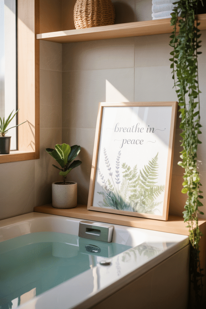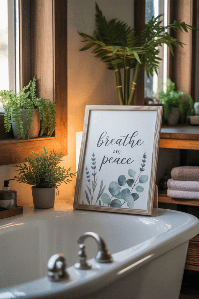 Choose a soft watercolor background featuring leaves or florals and overlay a message like Breathe In Peace. Frame it in natural wood and place it near your tub or sink. It reinforces a calming, spa-inspired ambiance that invites relaxation every time someone walks in.