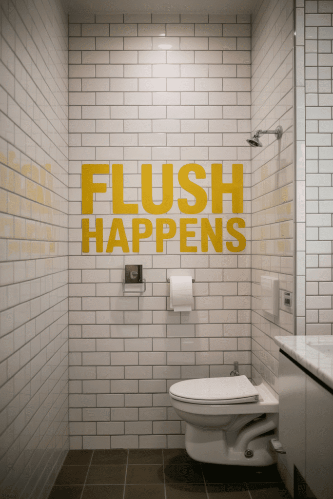 Create a modern statement piece with oversized text in a bright color. Sayings like Flush Happens or Soak It Up look great in high contrast palettes. This style works best as a focal point on an otherwise plain wall, drawing the eye instantly and sparking conversation.