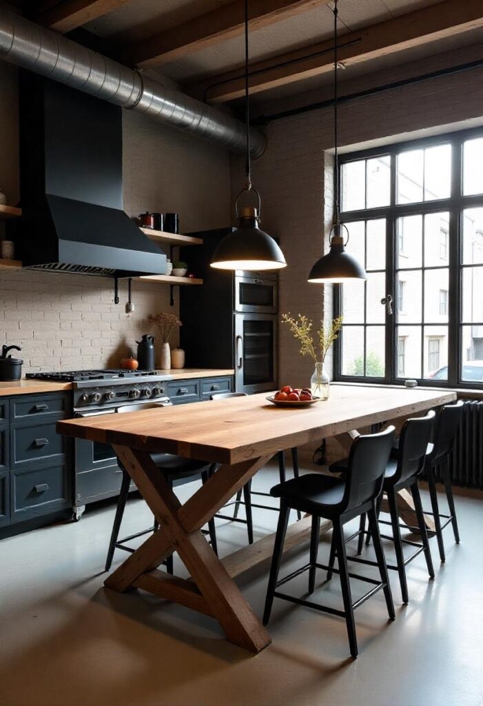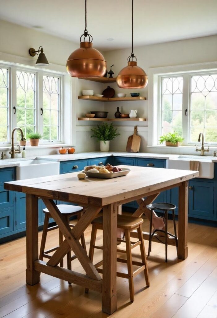 A vintage farm table can ground a kitchen with its solid wood build and lived-in surface. Use it as a prep table, breakfast island, or main dining space. The marks and wear from years of use bring a sense of authenticity that’s hard to fake. Pair the table with modern stools or a marble counter to balance the rustic texture with something more refined.