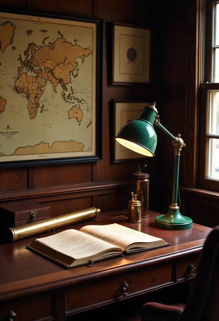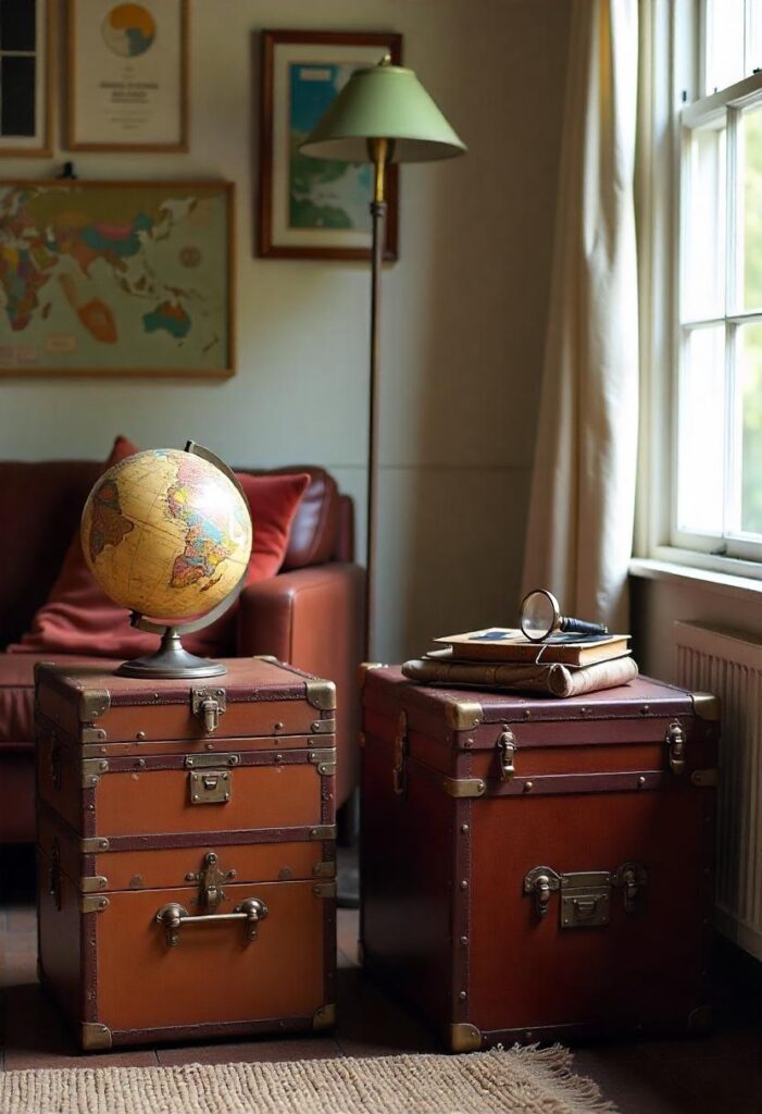Old maps, globes, and steamer trunks bring a travel-inspired look to studies or living rooms. Grouping these pieces thoughtfully can make the room feel collected and personal. Leather trunks work well as side tables, while framed maps add context and story. Look for pieces that show wear as they add character to the decor.