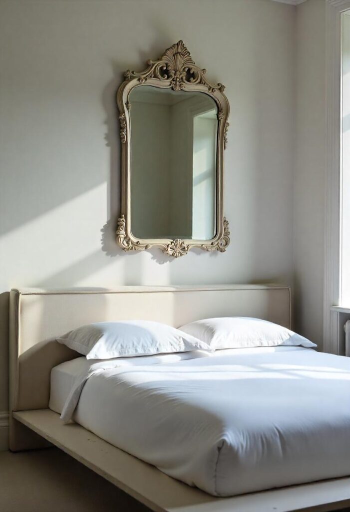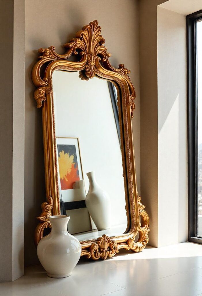 Ornate antique mirrors with gilded or carved frames work well in both traditional and modern interiors. They help reflect light and can visually expand smaller rooms. Use a large mirror in a hallway or entry to brighten the space, or a smaller one above a dresser or mantel. The contrast between a detailed frame and a simple wall gives the mirror more impact.