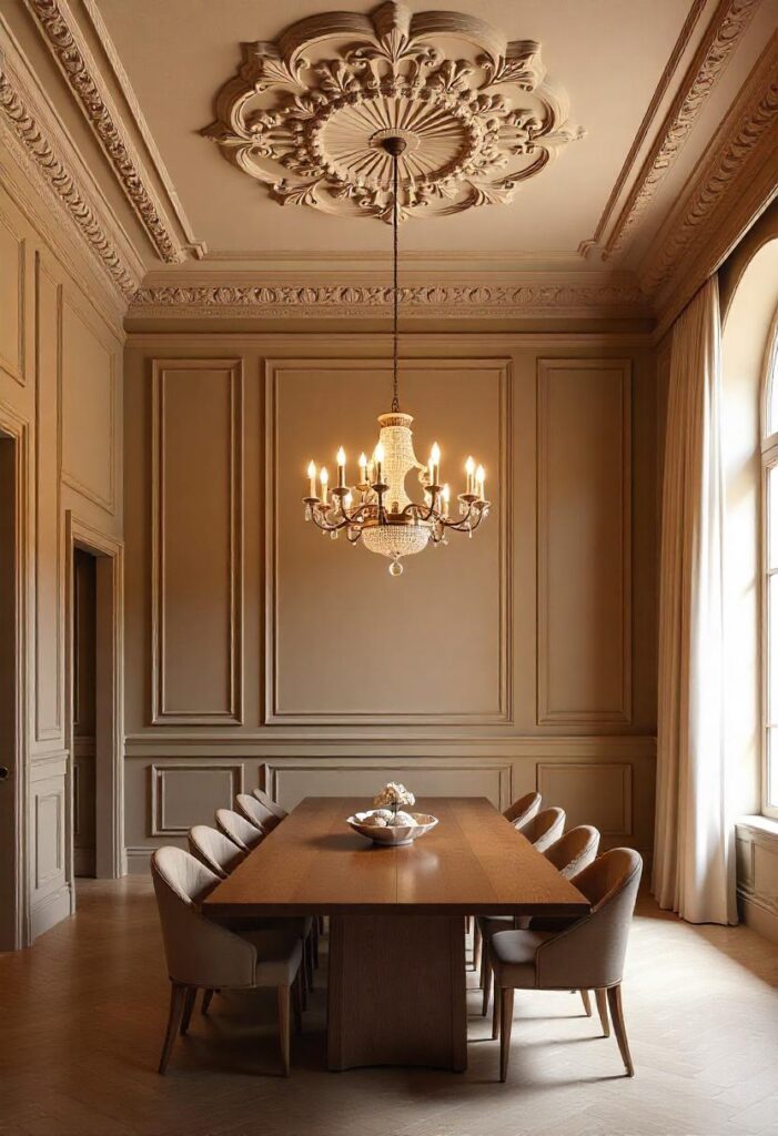 1. Ornate Ceiling Medallions Paired with Contemporary Lighting