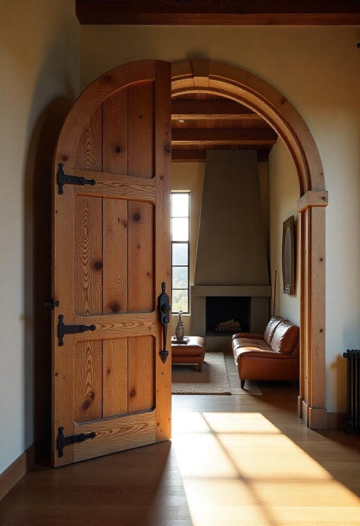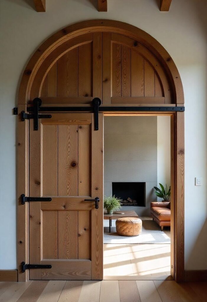 Old church doors with pointed arches can be repurposed as interior features. Their unique shape and solid wood construction give them presence, whether used as a room divider or mounted sliding door. The worn finish and original hardware often tell their own story, so it’s best to keep the surface as-is. These doors offer both privacy and architectural interest without fully closing off a space.