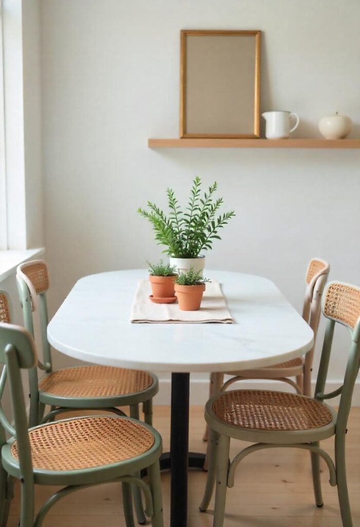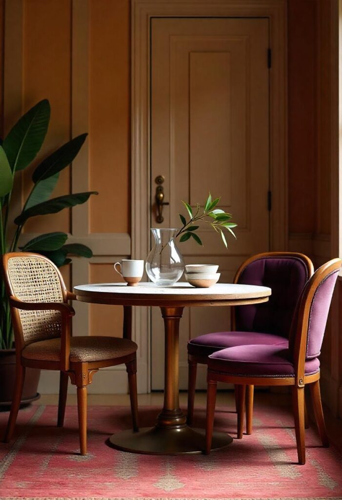 Bring European charm into your morning routine with this intimate dining setup. The circular table shape promotes better conversation than rectangular options. Built-in bench seating offers hidden storage for rarely used kitchen items. It’s perfect for kitchens where space is limited but style shouldn’t be compromised. The combination of natural materials and vintage touches makes even quick breakfasts feel special. The nook’s compact size actually encourages more frequent use than a formal dining room might.
