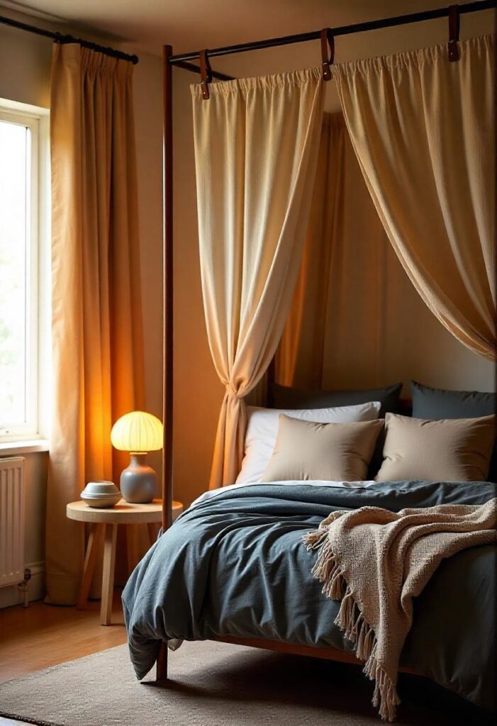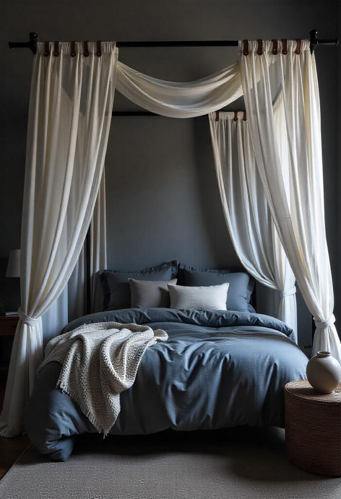 This design creates a luxurious focal point in the bedroom. The flowing drapes add softness while maintaining an airy feel. Unlike traditional four-poster beds, this version makes rooms appear more spacious by drawing the eye upward. The canopy’s fabric actually helps filter morning light for a gentler wake-up experience. It’s perfect for those who want hotel-style elegance with a bohemian touch. The canopy frames the bed beautifully while allowing for creative fabric choices that can change with your mood or season. The suspended design also creates better air circulation around the sleeping area for improved comfort.