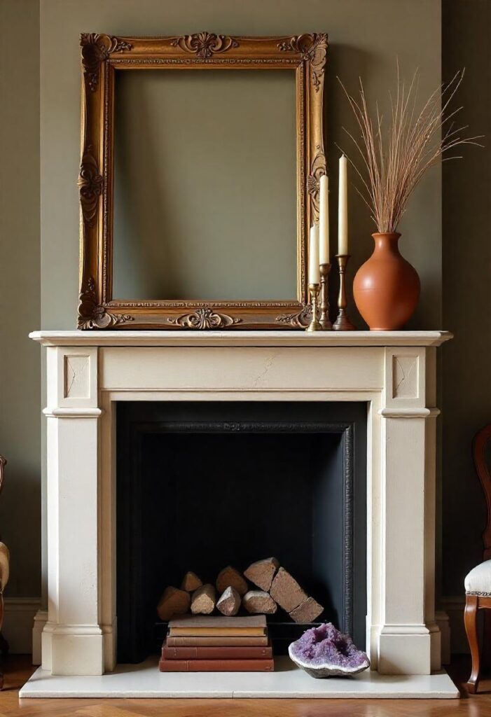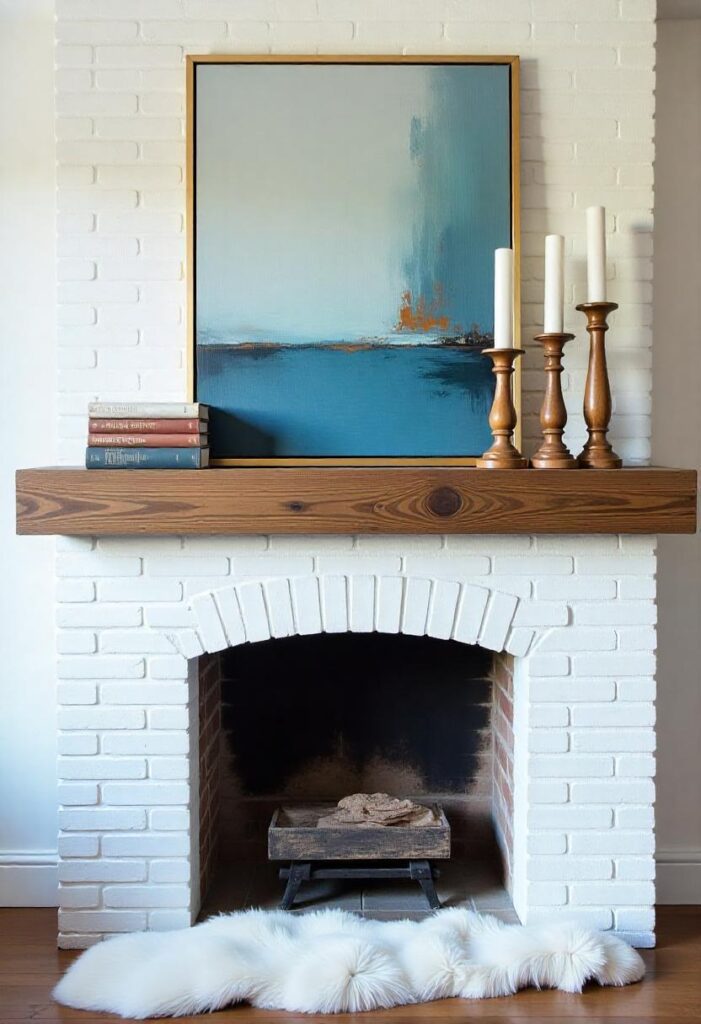 An intentionally unbalanced mantel arrangement feels more personal and inviting than perfect symmetry. This approach allows you to showcase collected treasures and artwork in a natural way. The staggered elements actually make the fireplace appear larger and more substantial. Unlike matched sets, this styling encourages you to rotate decor pieces seasonally without needing complete overhauls. It works especially well in living rooms where you want to create a relaxed, lived-in atmosphere. This arrangement also draws attention to architectural details you might otherwise overlook.