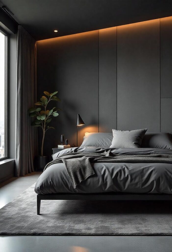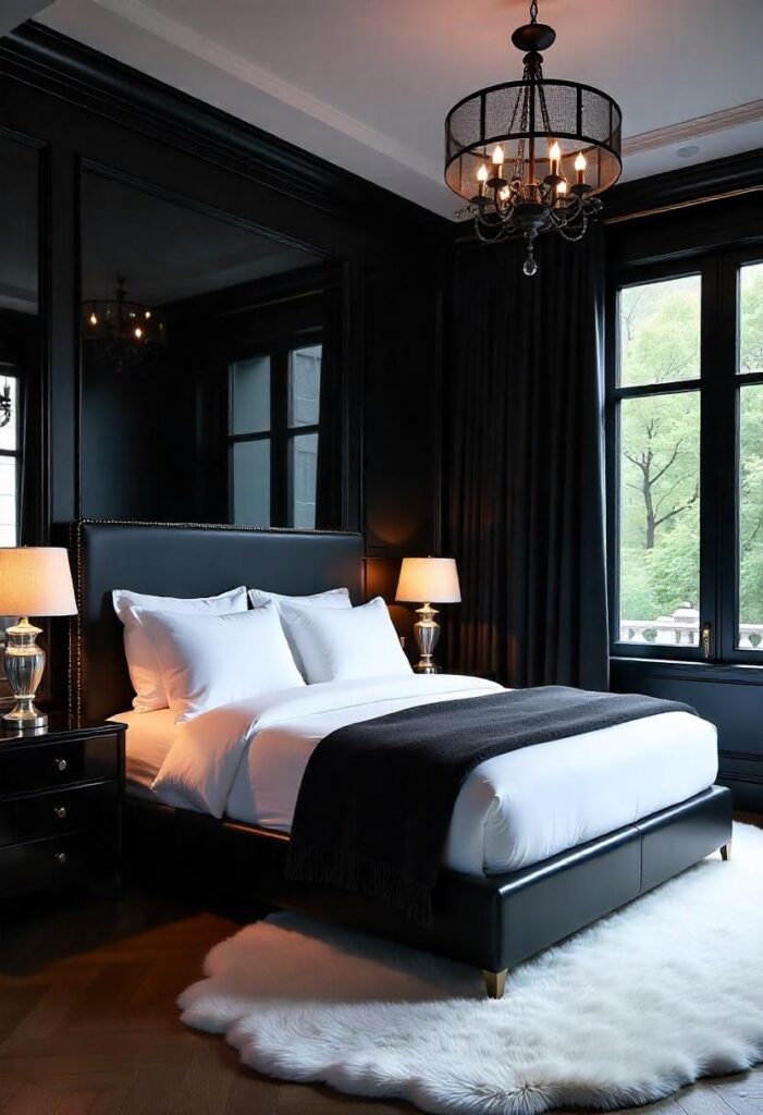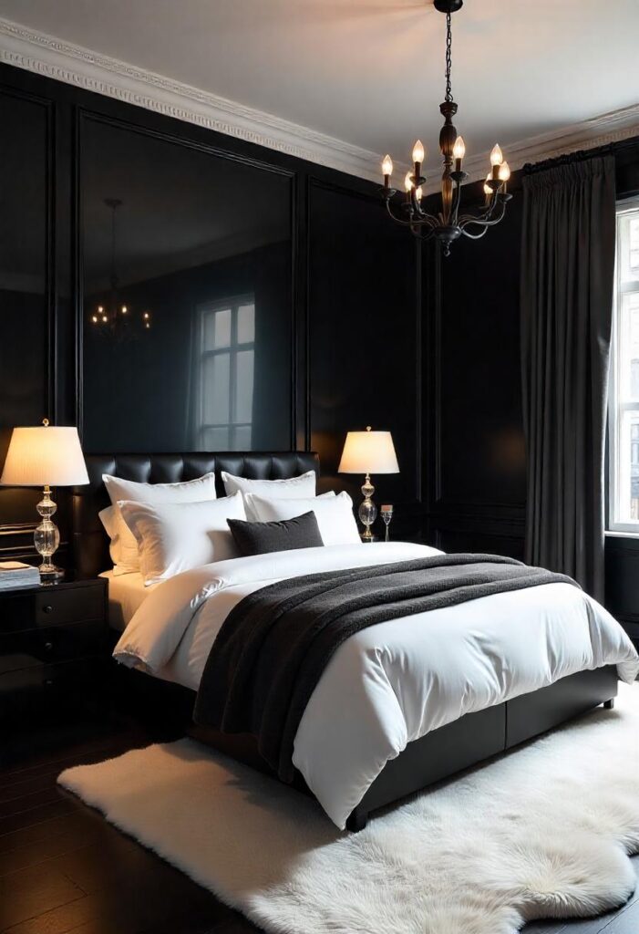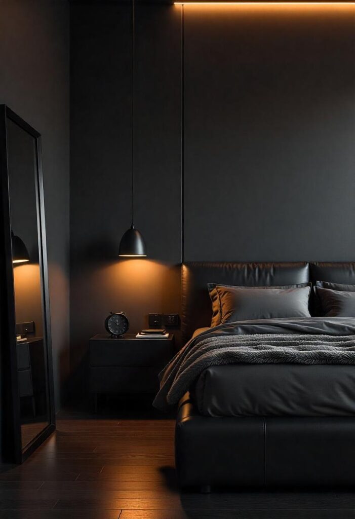 Jet black, when done right, creates a bold and polished setting. The gloss finish reflects light and keeps the walls from feeling too flat. Use light-colored bedding and metallic details to maintain contrast. Lighting must be layered across the room to prevent dark corners. A single accent wall may be enough in small bedrooms. This color suits a clean and minimalist space.