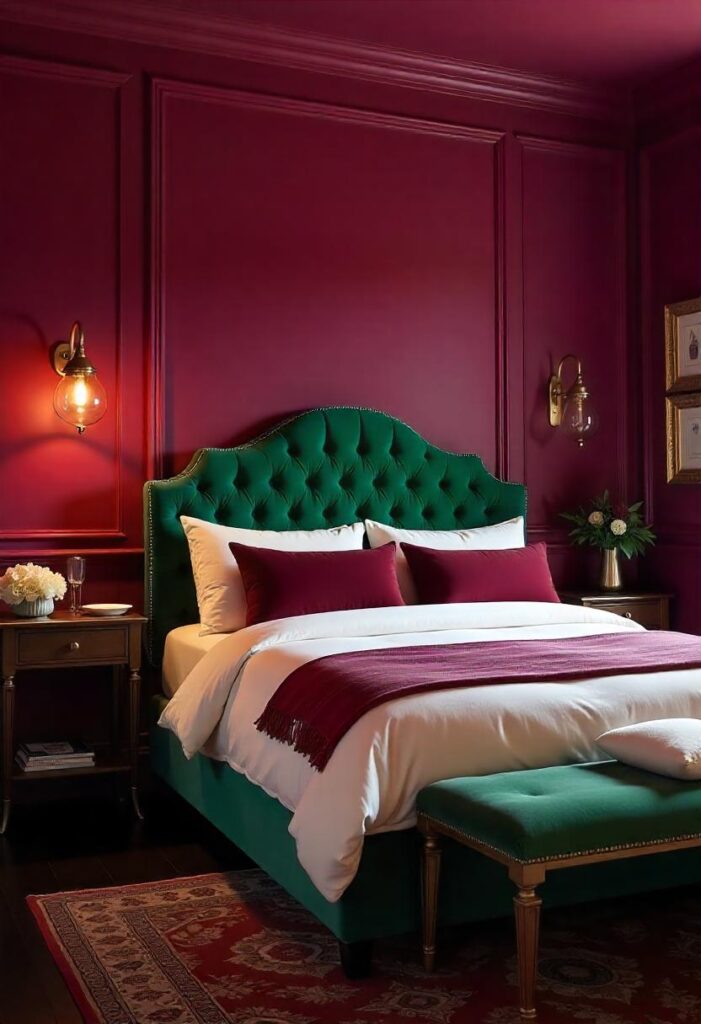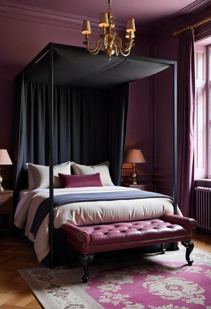 This dark plum shade adds richness without looking too heavy. Velvet fabrics in jewel tones enhance its visual impact. Use aged brass and soft lighting to support the depth of color. A white ceiling or trim helps maintain structure in the space. This color works well in traditional rooms with crown moldings or older features. Best applied in medium to large bedrooms.
