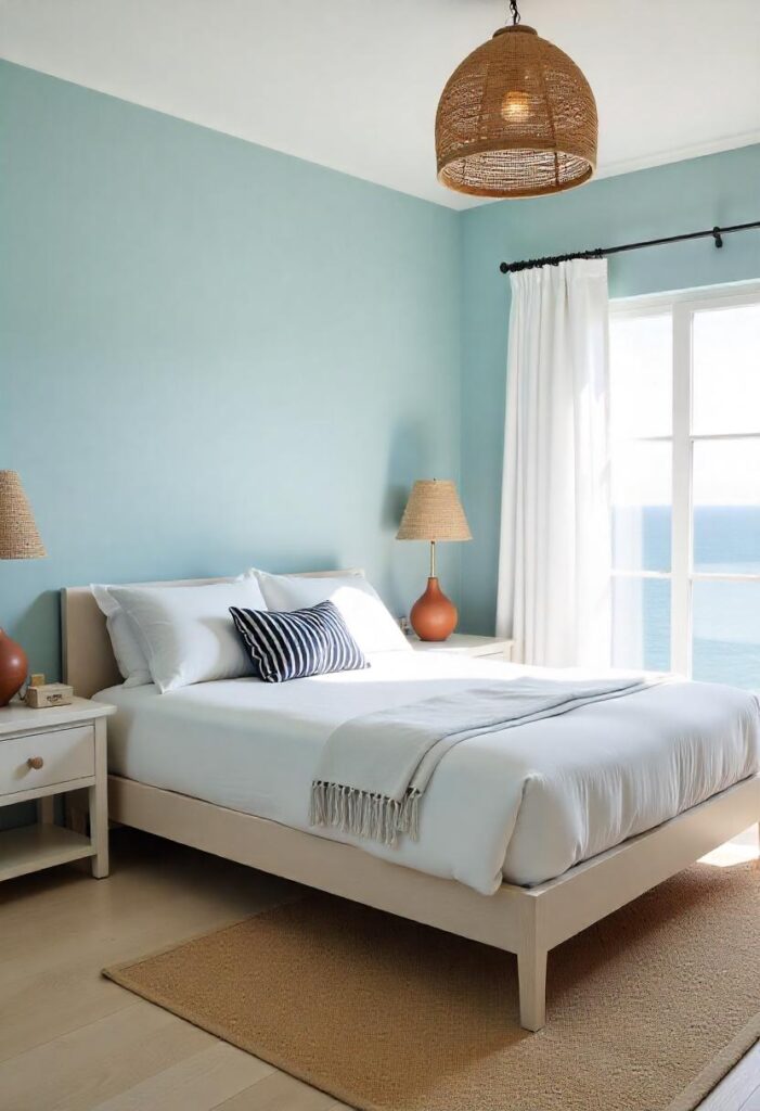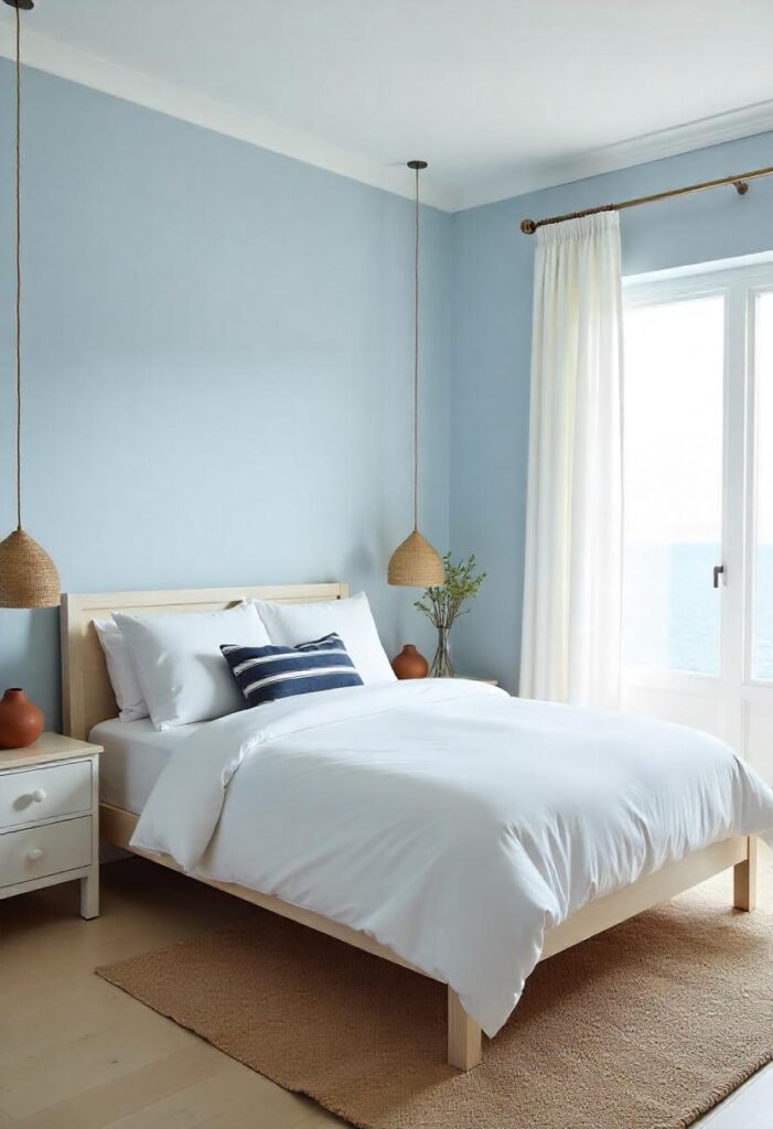 A soft blue with a touch of gray offers a light and modern look. Pair it with woven baskets, white oak, and soft curtains. The result feels fresh without being overly styled. Avoid using themed accessories to keep it sophisticated. This shade helps small rooms appear larger. Natural daylight will enhance its subtle shifts in tone.