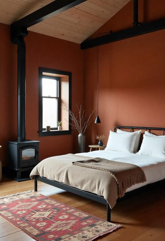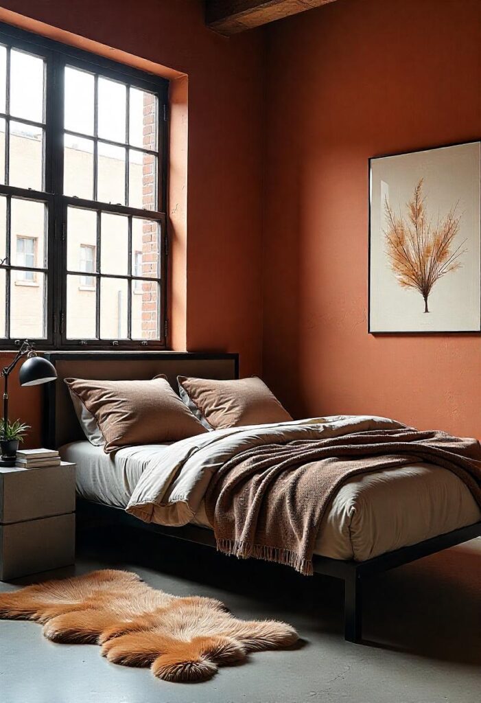 Burnt sienna brings heat and balance to cool-toned interiors. Combine it with black steel or unfinished concrete for contrast. Choose flat finishes to highlight the natural character of the color. Use leather or shearling to add softness where needed. This look performs best in spaces with exposed architecture. Furniture should stay simple and low-profile.