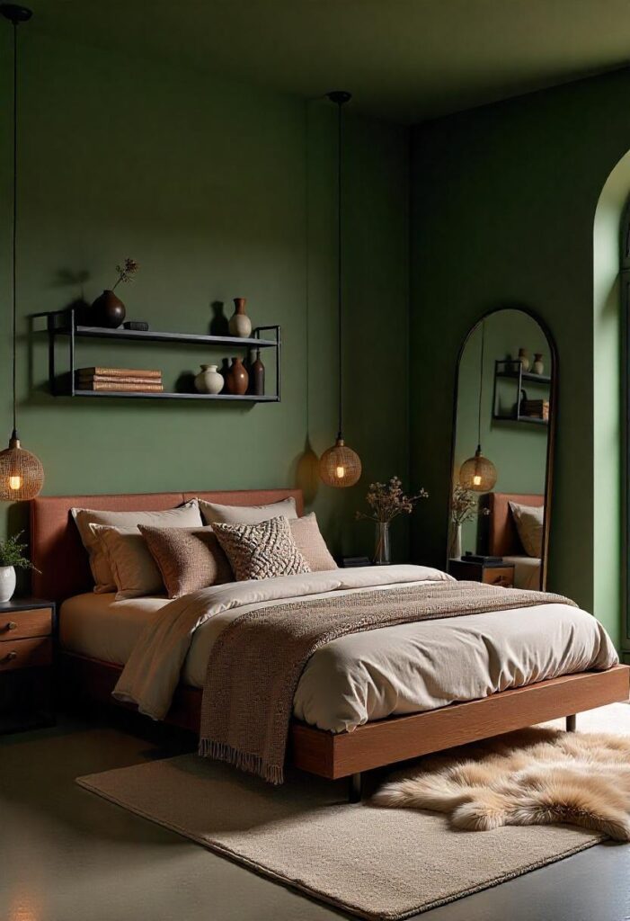This deep green gives the room a calm and grounded feeling. It works especially well with walnut or mahogany furniture. Use a matte or eggshell finish for a more natural effect. Brass light fixtures add warmth without overpowering the look. Keep textiles organic to support the relaxed atmosphere. Best used in rooms with plenty of natural light.