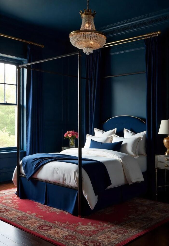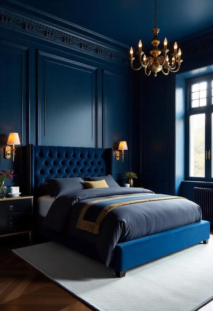 Midnight blue adds richness without overwhelming the space. Gold elements help lift the mood and prevent the room from feeling closed off. Glossy paint reflects ambient light in a subtle way. Pair with white bedding to maintain brightness. Ideal for larger rooms with high ceilings. Lighting should be soft and warm to bring balance.