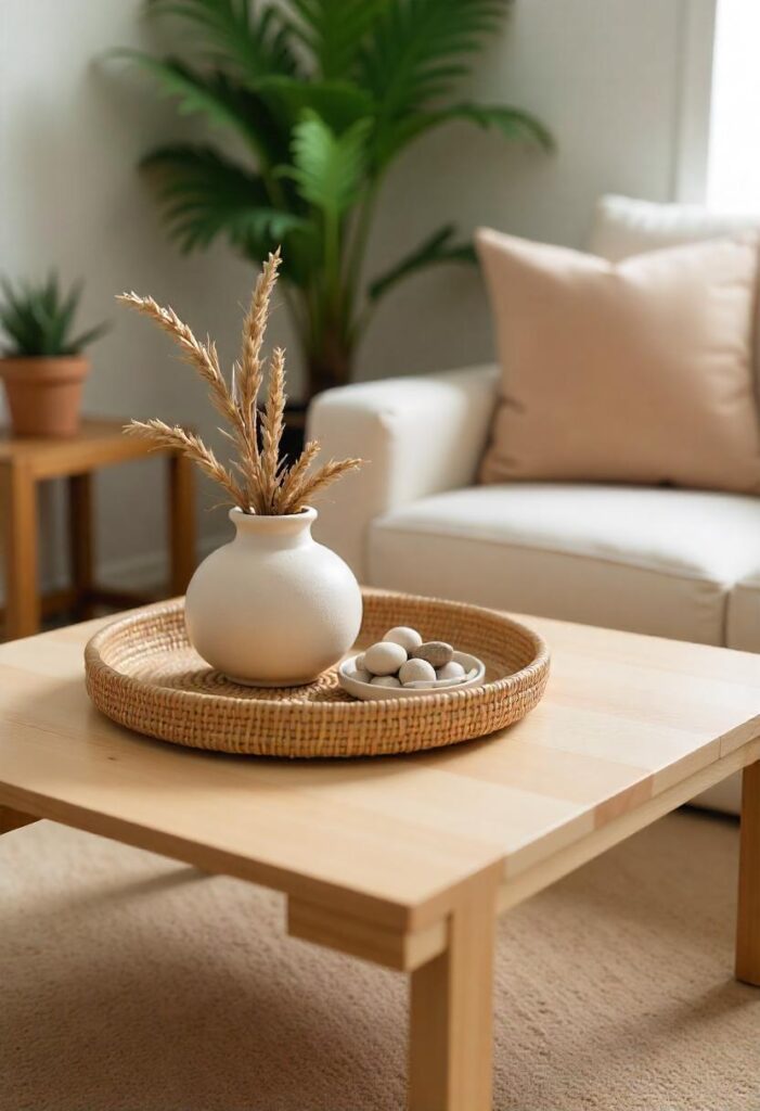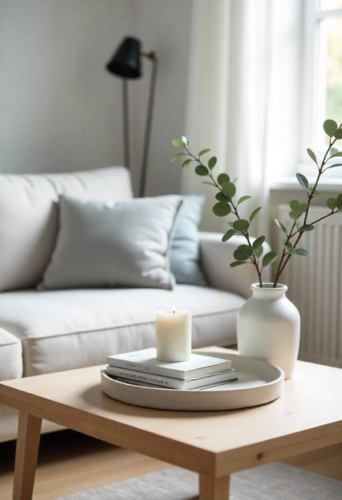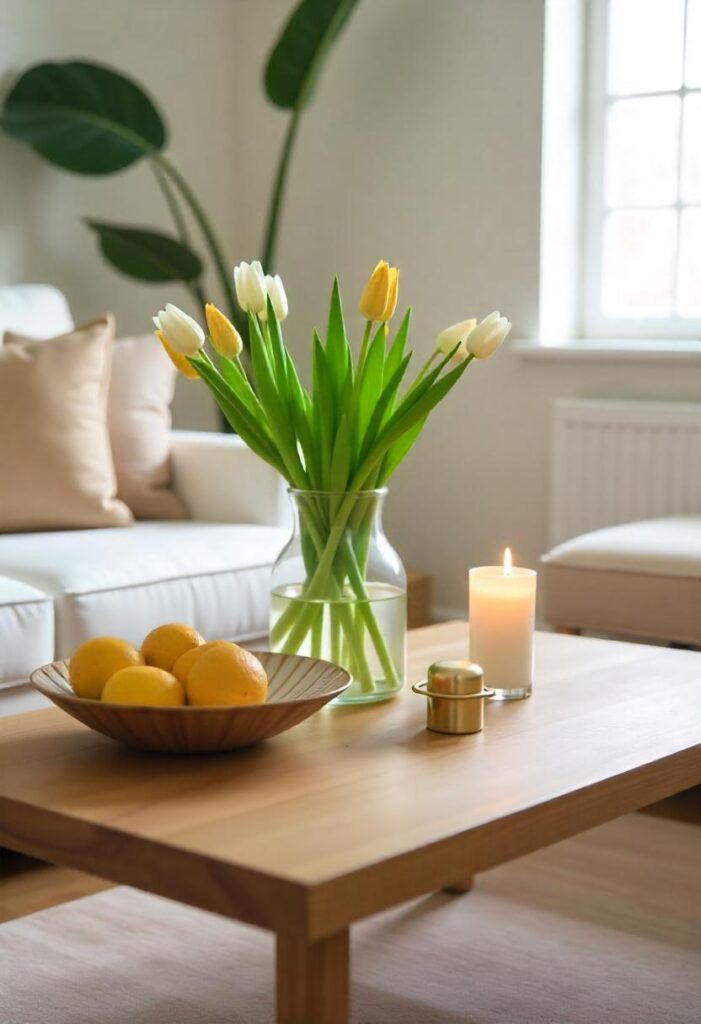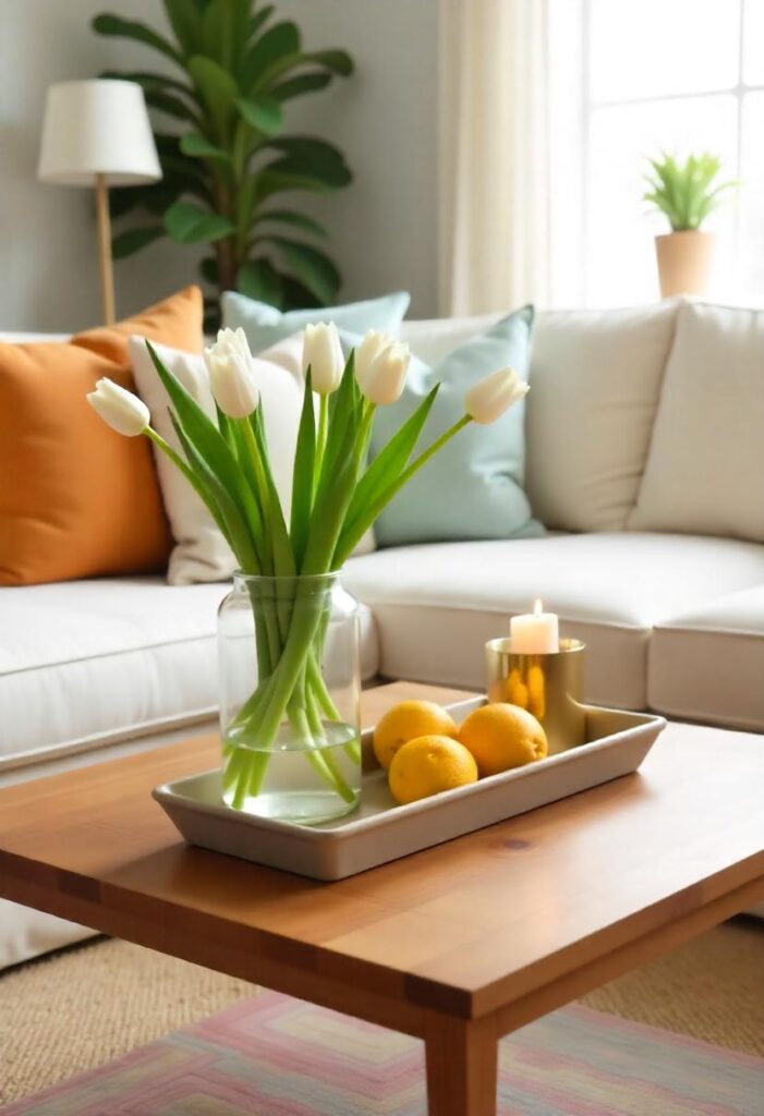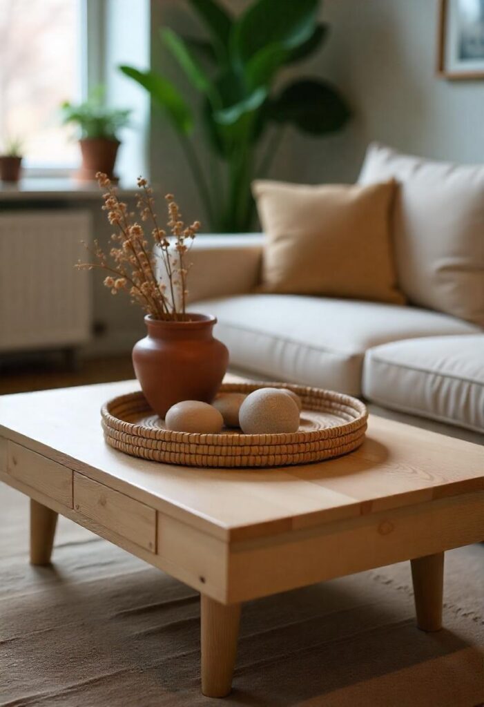 This layout changes with the time of year. In spring, a vase of fresh flowers and a bowl of lemons adds brightness. In autumn, dried foliage and pinecones can create warmth. Use simple items that reflect colors and textures from outside. You won’t need to change furniture to adapt this layout. It keeps your space feeling aligned with what’s happening around you.
