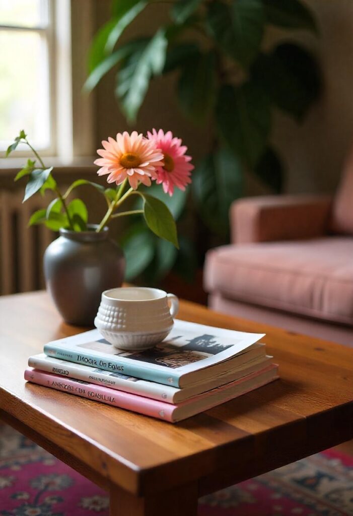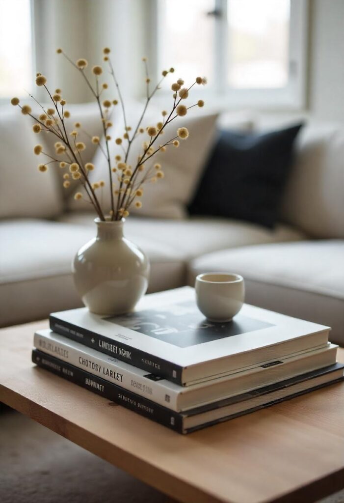 Divide the table into mirrored halves. Use two identical book stacks and top each with a matching candle or planter. Place a decorative bowl or neutral tray in the center. This layout suits long rectangular tables in larger rooms. Symmetry adds rhythm and predictability to the space. It’s ideal when furniture placement already leans toward structured design.