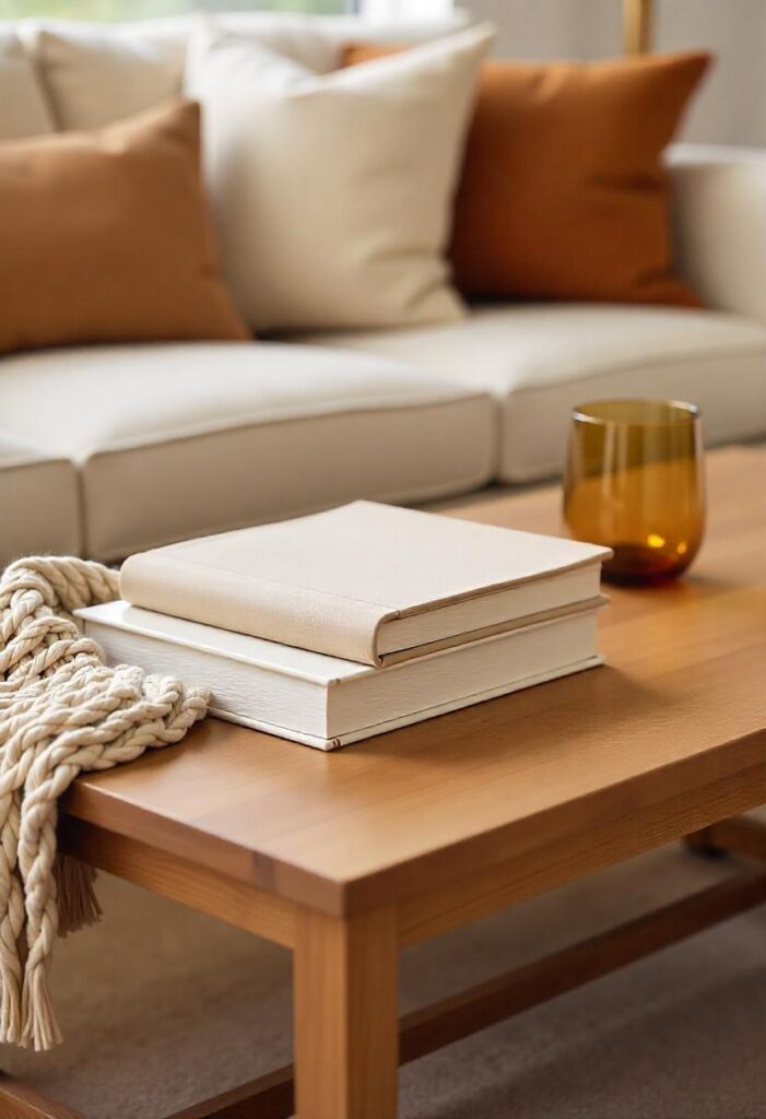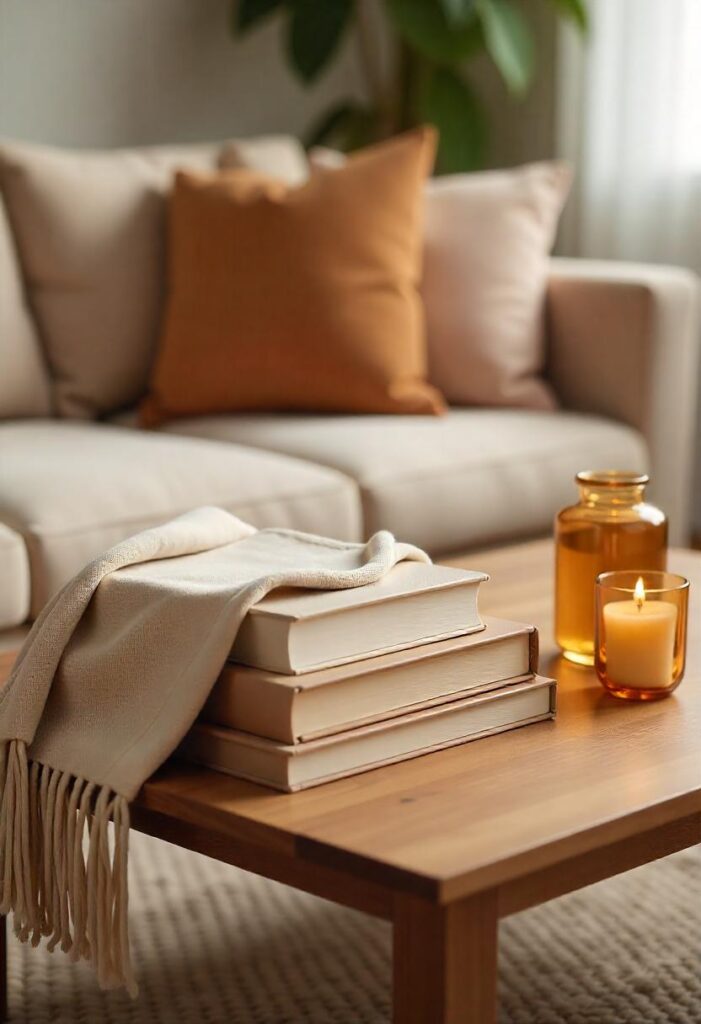 Arrange a short stack of hardcover books with refined covers at one end of the table. Fold a neutral-toned throw and place it diagonally across a corner to soften the edges. Use a low-profile candle or dish on top of the books for height variation. This layout introduces tactile contrast and layering. It pairs well with wood or fabric-upholstered furniture. The setup encourages relaxed yet tidy visual flow.