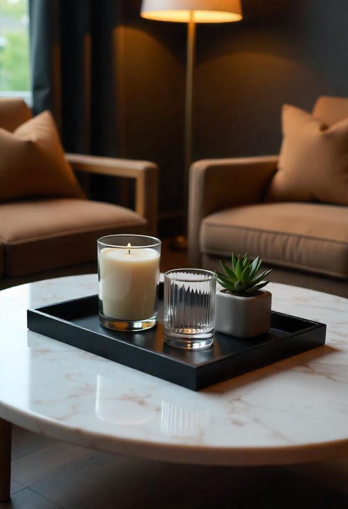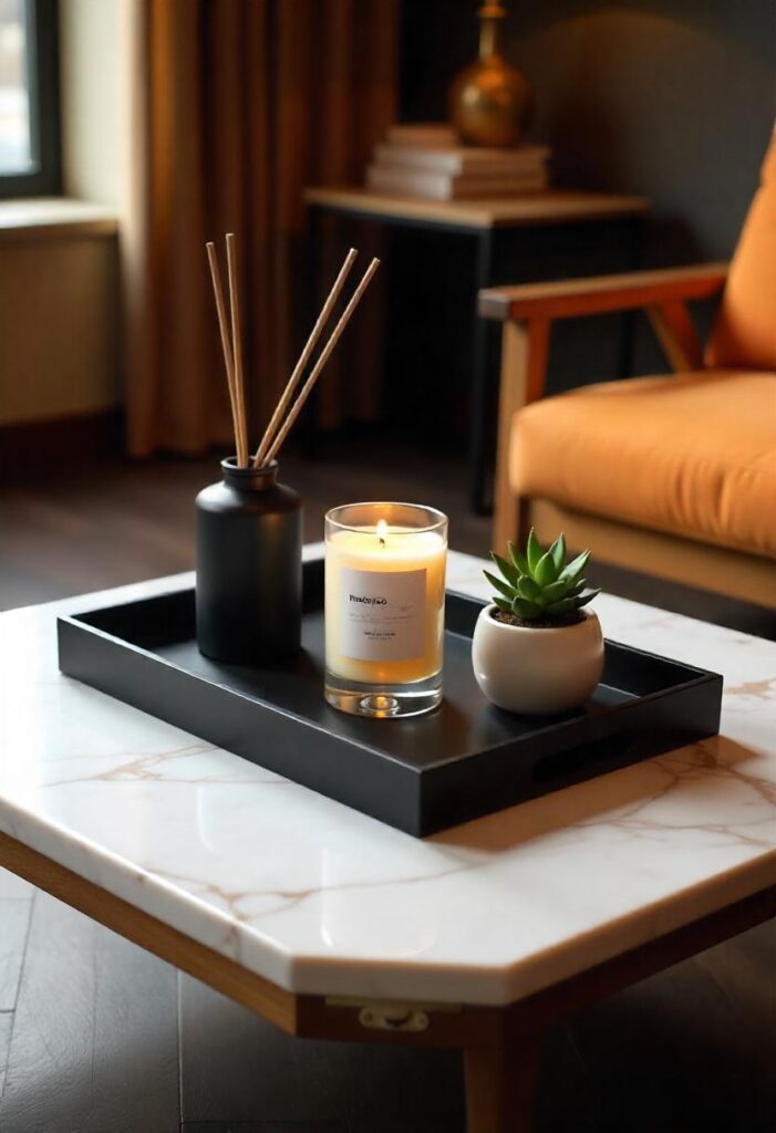 Start with a rectangular tray in marble, black wood, or lacquer. Add a slim diffuser, a scented candle, and a small potted plant. Position each item by height and shape to avoid visual clutter. This arrangement keeps items unified while introducing sophistication. It also helps keep loose items like remotes or lighters grouped. Use this on tables of any finish from glass to stone.
