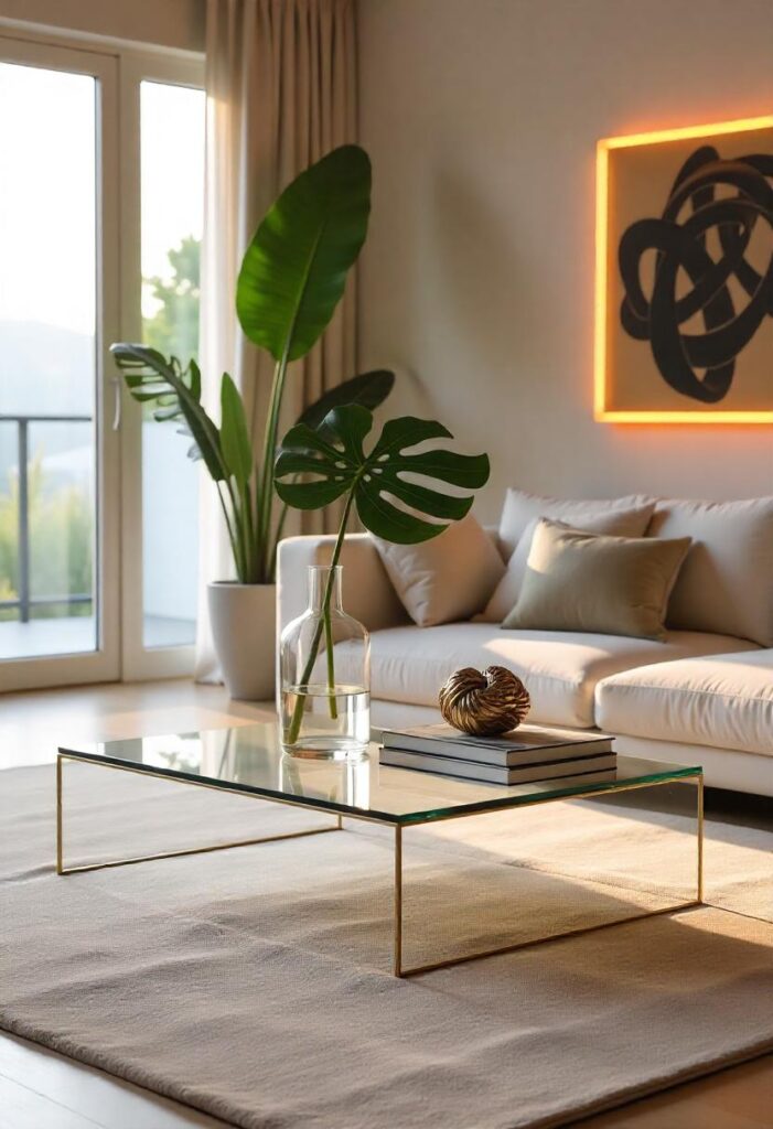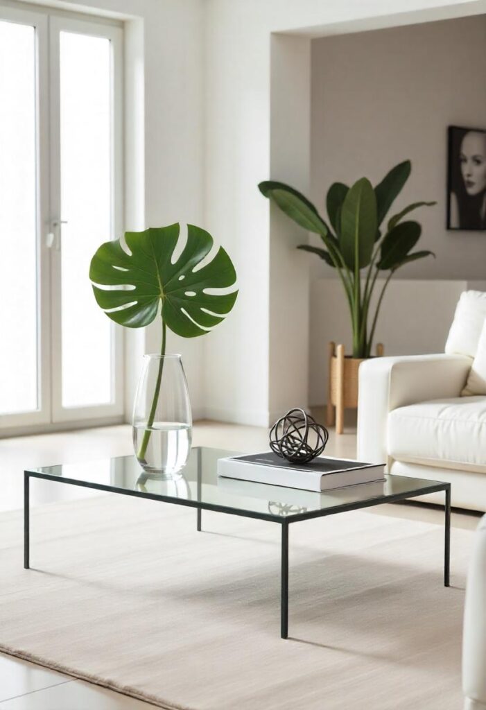On glass-top tables, transparency already offers visual lightness. Add a sculptural object like a knot or sphere, one oversized book, and a tall vase with a single stem. Space the pieces apart so the table feels uninterrupted. Avoid filling every inch. Use the structure of the table as part of the aesthetic. This layout suits rooms with modern, open-plan architecture.