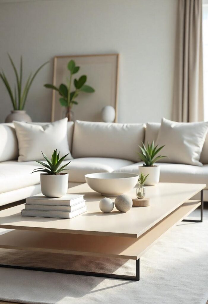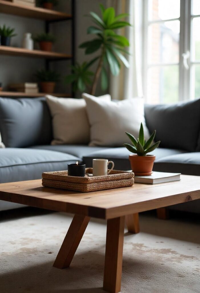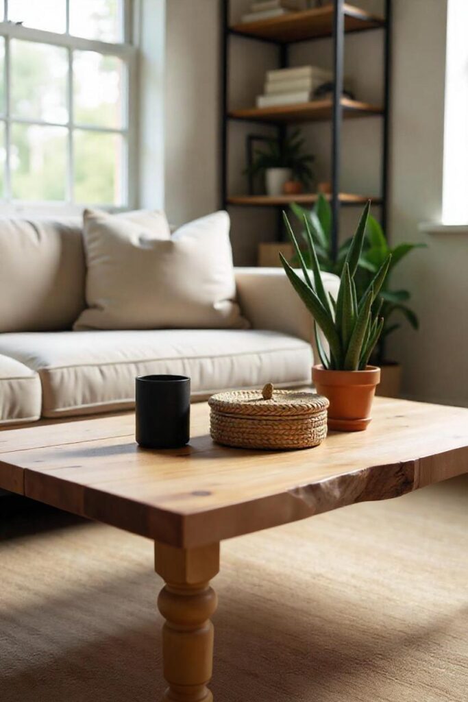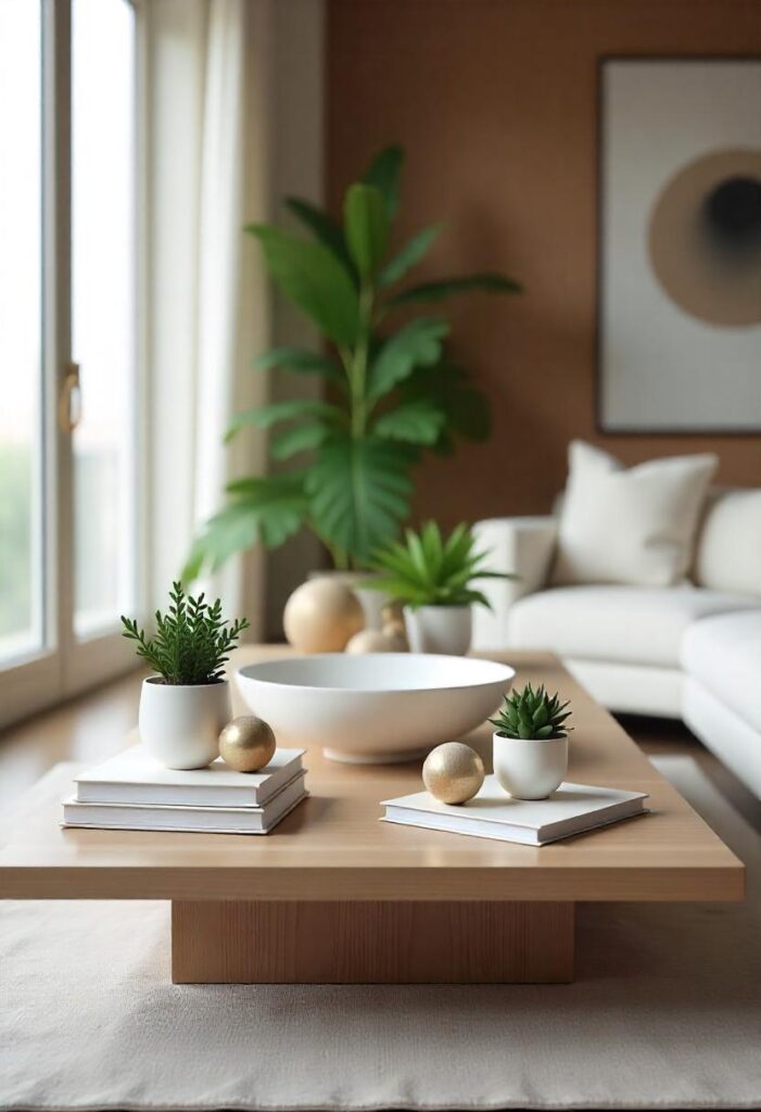 Use a box or tray to store smaller everyday items. Add a low-maintenance plant and a sculpted candle for balance. Keep decorative objects toward one side for an asymmetrical feel. This setup keeps surfaces looking intentional while remaining useful. It suits family rooms, media areas, and shared seating zones. The layout is ideal for people who use their coffee table daily.