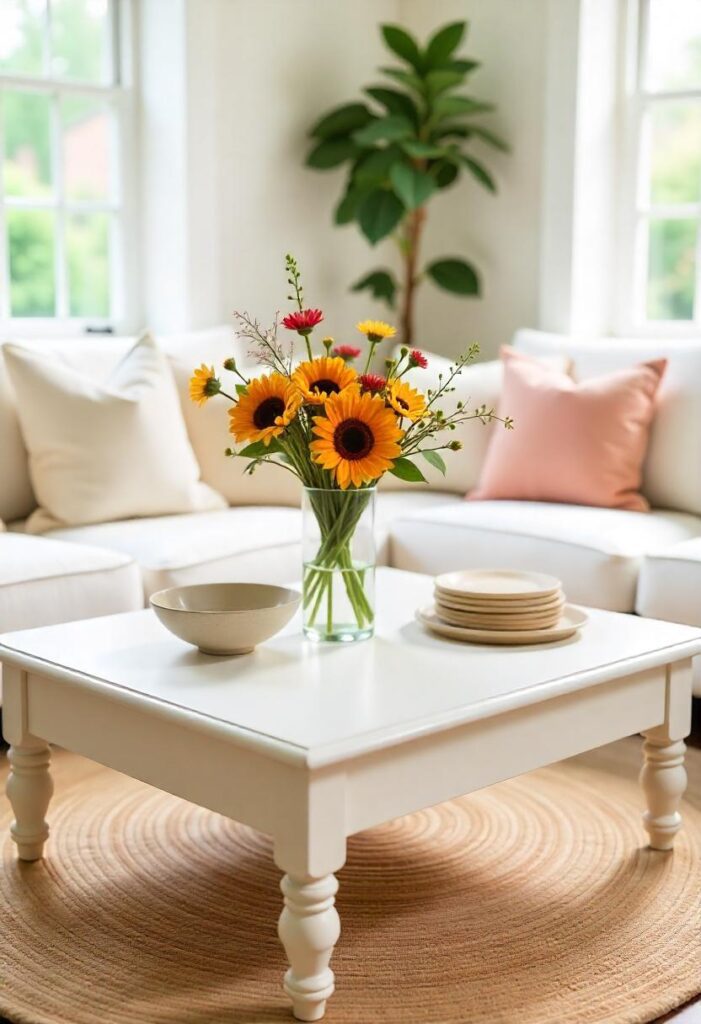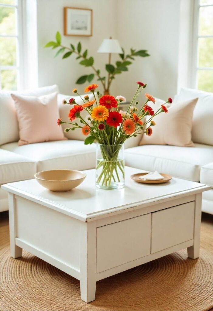 Choose a vase with height and place it directly in the center. Fill it with seasonal blooms or a single bold type like hydrangeas. Pair it with a curved ceramic dish and small coasters on one side. Let the floral color influence the rest of the room’s palette. This layout works best when other surfaces are kept neutral. It’s a strong visual anchor for guest areas.