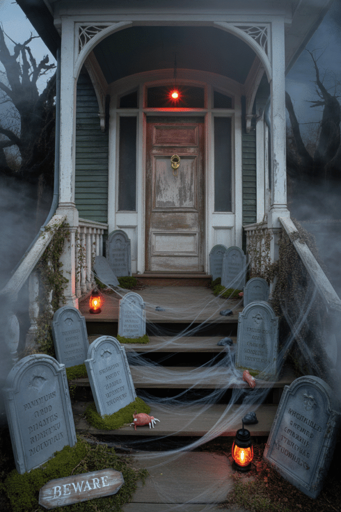 Transform your porch into a spooky graveyard with fake tombstones, skeletons, and fog. Create a path leading to the door with eerie lighting, such as lanterns or red spotlights. For added creepiness, scatter some plastic rats, spiders, or cobwebs around the graves to give the illusion of an abandoned cemetery.