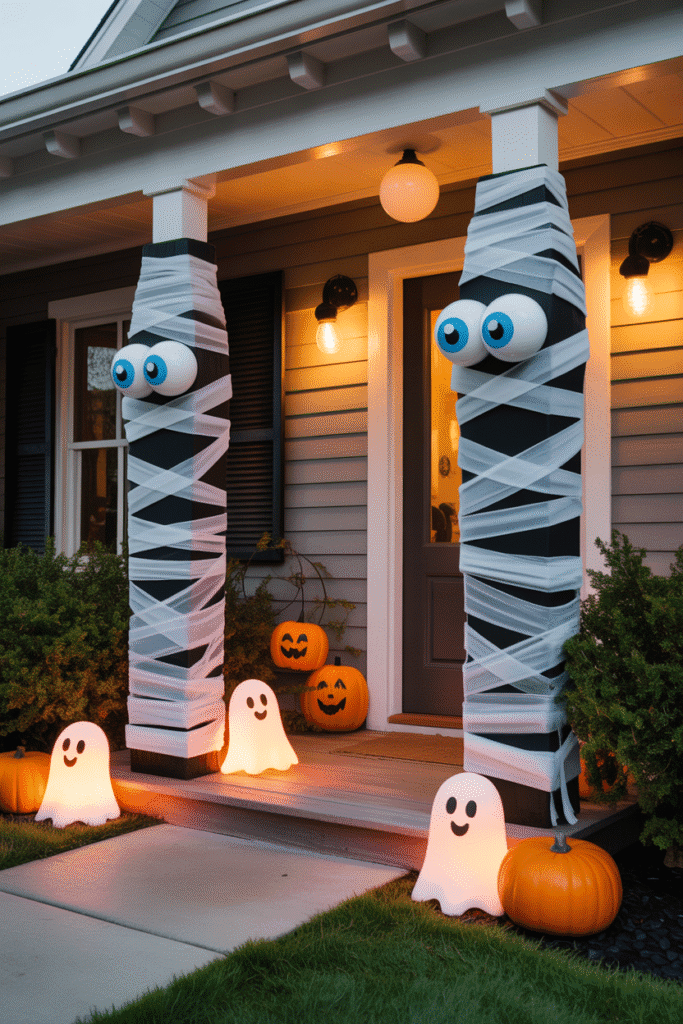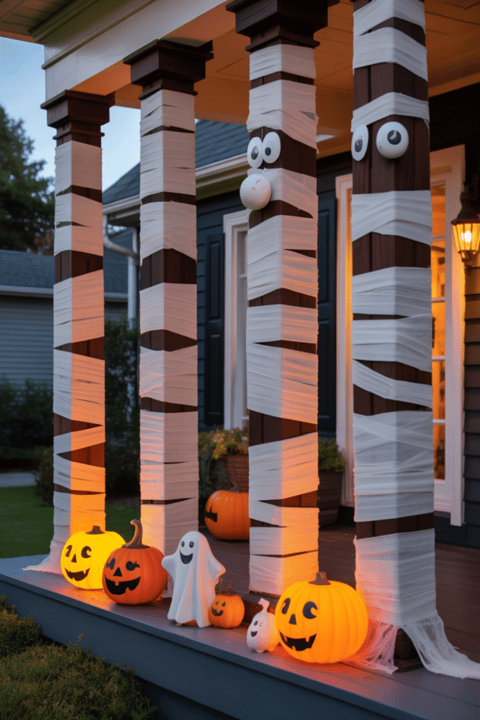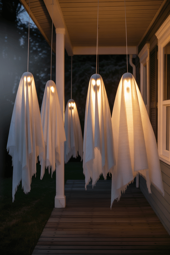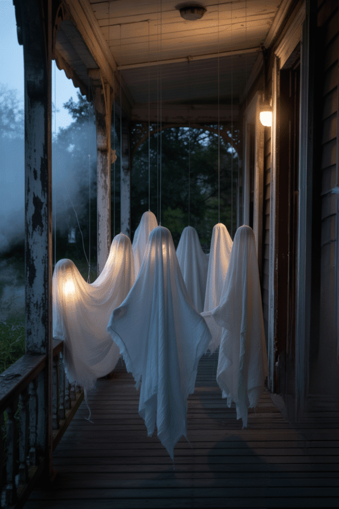 Make your porch even more spooky by hanging ghostly figures from the ceiling, porch posts, or trees nearby. Use white sheets or cheesecloth, stuff them with lightweight materials to give them shape, and suspend them with fishing line for a floating effect. Add an eerie glow with soft lighting or make them flicker with a wind fan for movement.
