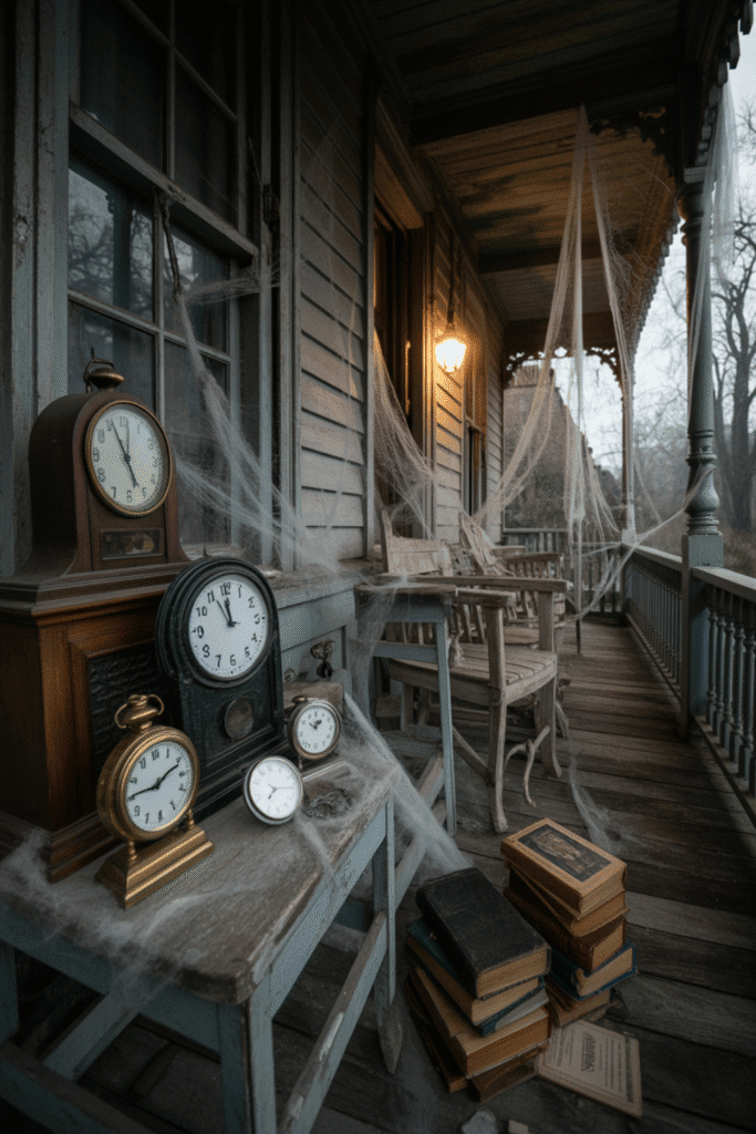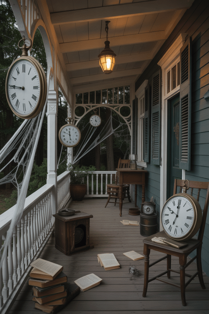 For an eerie, haunted atmosphere, add vintage clocks or pocket watches to your porch decor. Set them to a specific time, like midnight, and place them on tables or hanging from the porch ceiling. You can also incorporate clocks that appear “broken” or have cracks in them, suggesting that time has stopped in this spooky place.
