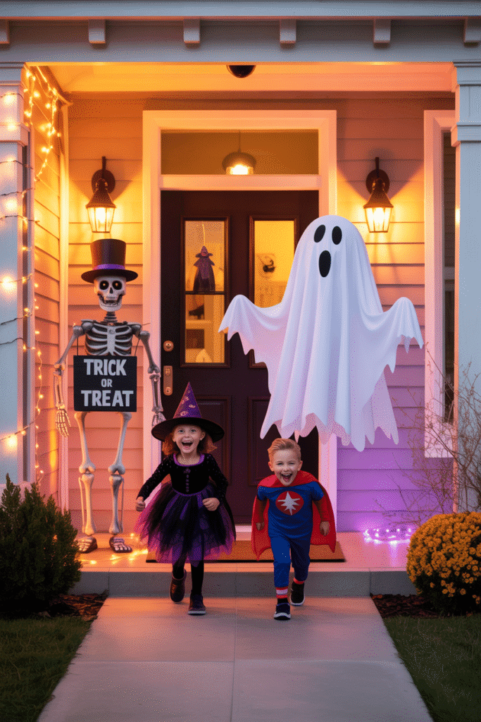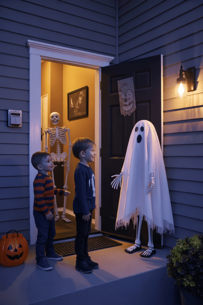 For a truly interactive Halloween porch experience, set up a motion-activated prop, such as a talking skeleton or animated ghost, that surprises guests as they approach your door. You can also use a “magic” doorbell that triggers a spooky sound effect or light show when pressed. These fun additions will keep the Halloween spirit alive and give visitors something to talk about.
