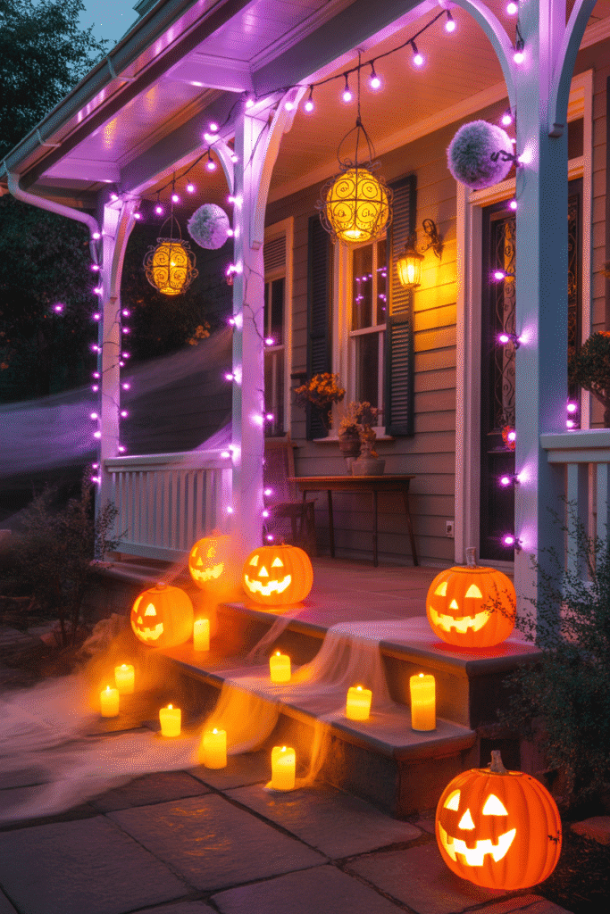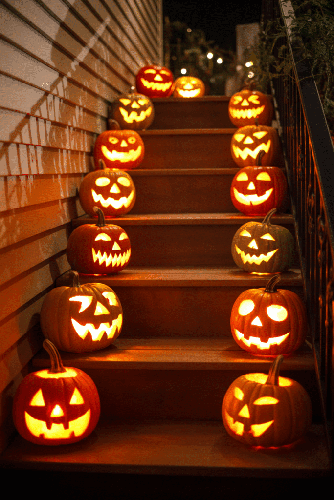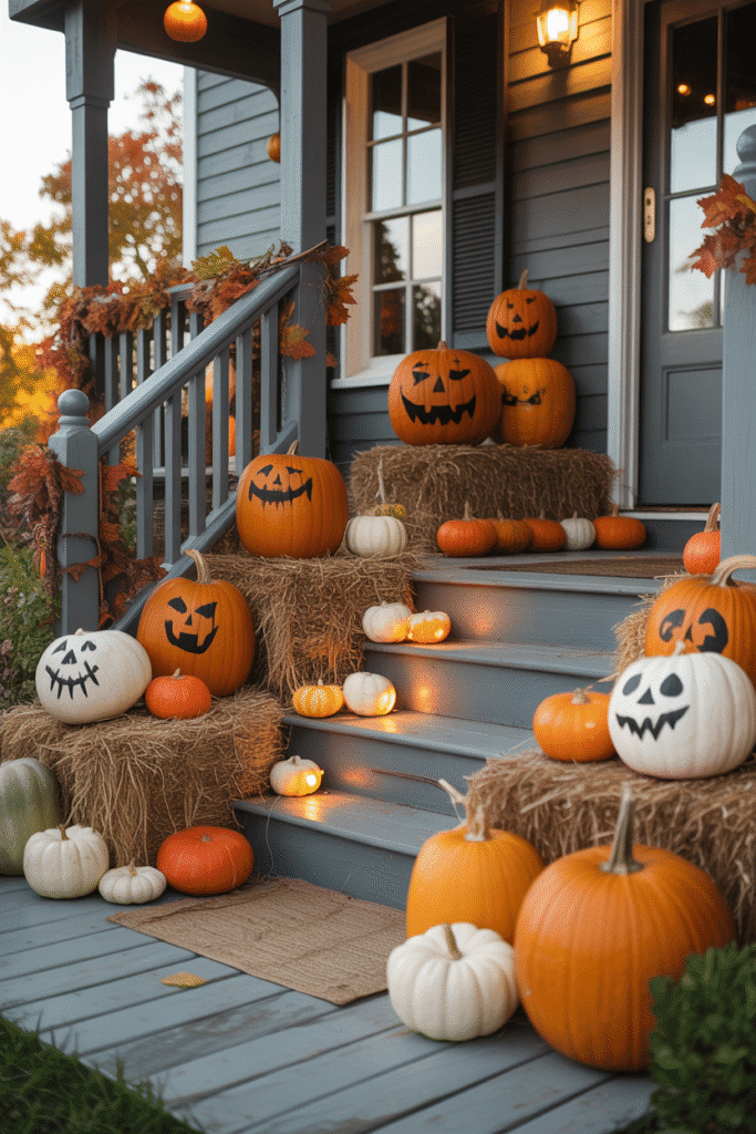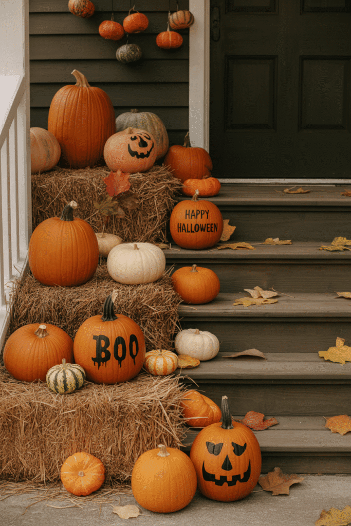 You can never go wrong with a pumpkin display! Arrange a variety of pumpkins and gourds in different sizes and shapes along the steps, railing, or hanging from hooks. For a creative twist, paint the pumpkins in spooky designs or use stencils for a unique look. Add some hay bales for texture and a rustic touch.