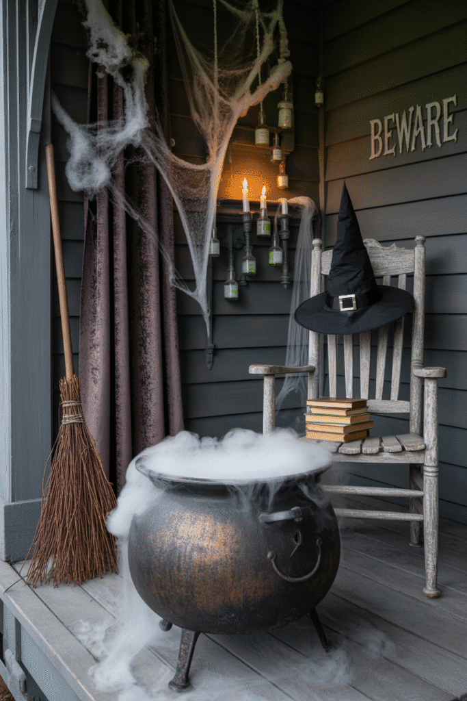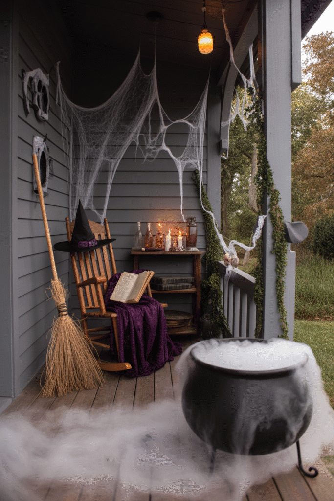 Create the illusion of a witch’s house on your porch with a broomstick, cauldron, and witch’s hat. Fill a large pot with dry ice for that foggy, mysterious effect. You can also hang old, tattered curtains, drape faux spider webs over furniture, and scatter small potion bottles or spellbooks to complete the look.