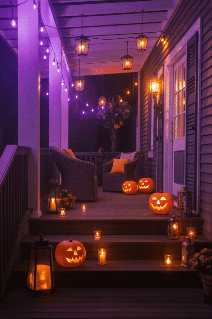 Lighting plays a huge role in outdoor Halloween decor, setting the tone for the entire scene. Use colored string lights, such as orange or purple, to create a festive atmosphere. Hanging lanterns or light-up jack-o’-lanterns will add to the spooky vibe. For a more chilling effect, incorporate flickering candles or LED lights that mimic fireflies.