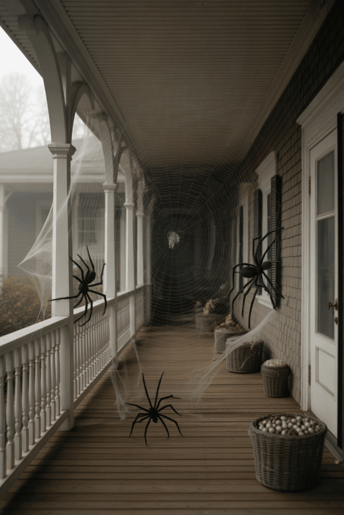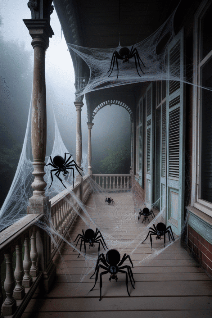 Take your love for creepy crawlers to the next level with giant spider webs that span the entire porch. Use black mesh material to cover the porch railings, columns, and ceiling, and then add oversized plastic spiders crawling across the web. You can also place a large spider in the middle of the porch for an added creepy touch.
