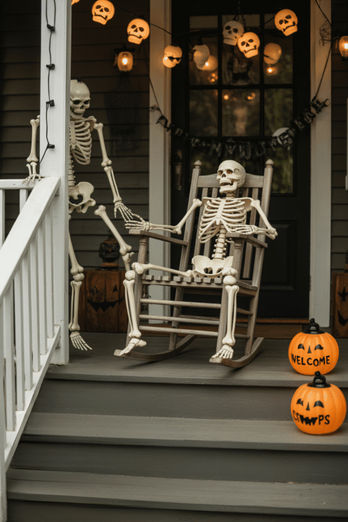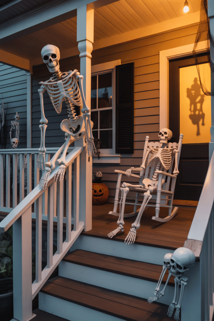 Make your porch a true bone-chilling experience with a skeleton-themed Halloween display. Set up a scene where skeletons are “interacting” in different ways—perhaps one is sitting in a rocking chair, another is hanging from the railing, and a third is creeping out from under the stairs. Light them up with motion-activated lights for that extra spooky surprise!