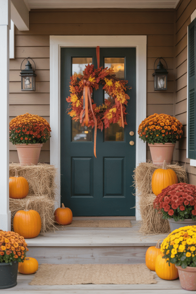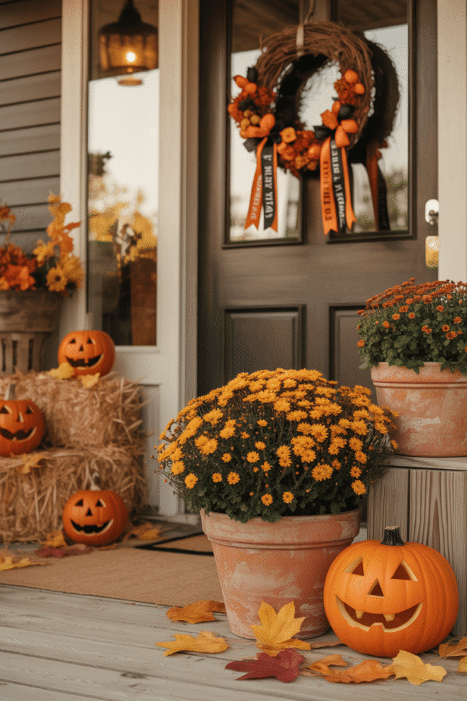Not all Halloween decorations need to be gory! Embrace the season’s colors by incorporating autumn-inspired decor, like fall leaves, mums, and wreaths. Add a Halloween twist by placing a few jack-o’-lanterns among the flowers or tying Halloween-themed ribbons around the wreaths. This look works well for those who prefer a less frightening Halloween aesthetic but still want to embrace the spirit.