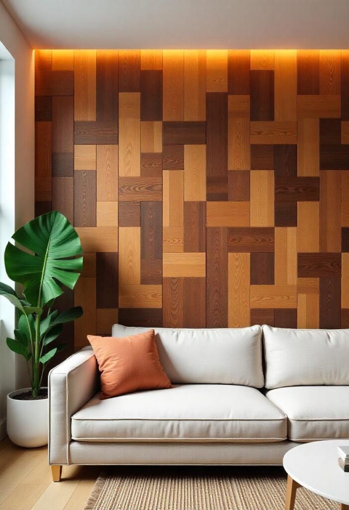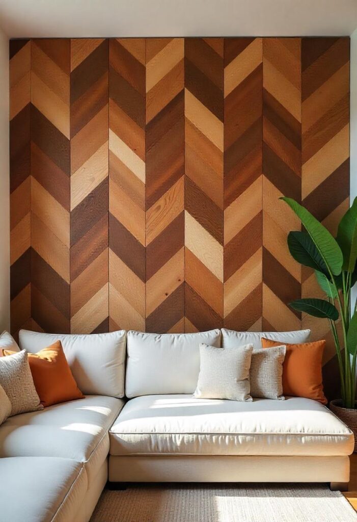 Reclaimed wood can be repurposed into geometric wall features using basic tools and stains. Arrange planks in herringbone, chevron, or abstract layouts for visual impact. Choose pieces in varied tones to add dimension to a flat wall. Use soft lighting to emphasize natural textures. This project suits both single accent walls and larger surfaces. It is often mounted using hidden brackets or construction adhesive.