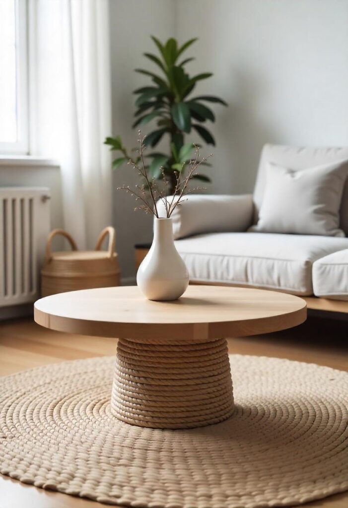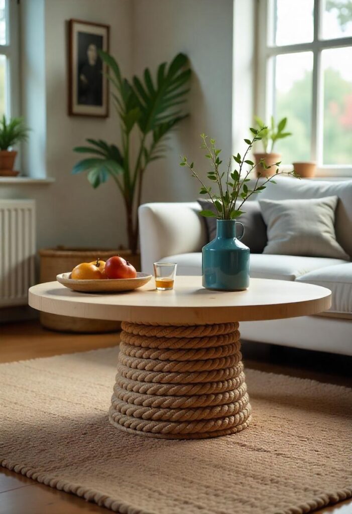 A basic coffee table frame can be updated by wrapping it with thick jute or sisal rope. Start at the base and tightly coil upward for uniform coverage. Secure the ends with industrial adhesive for durability. Round and square shapes both work with this method. Use rope in its natural tone or dye it for added contrast. This idea works best with simple table forms.