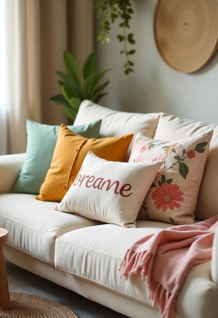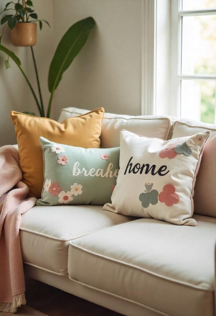Create new cushion covers from repurposed materials like old clothing or scarves. Add embroidery, appliqué, or stitched lettering for visual identity. Include zippers or envelope closures for convenience. Handcrafted patches or fabric paint can be applied to small sections. Mix patterns intentionally, avoiding overly similar prints side by side. Proper measurement and fabric cutting ensures alignment during sewing.