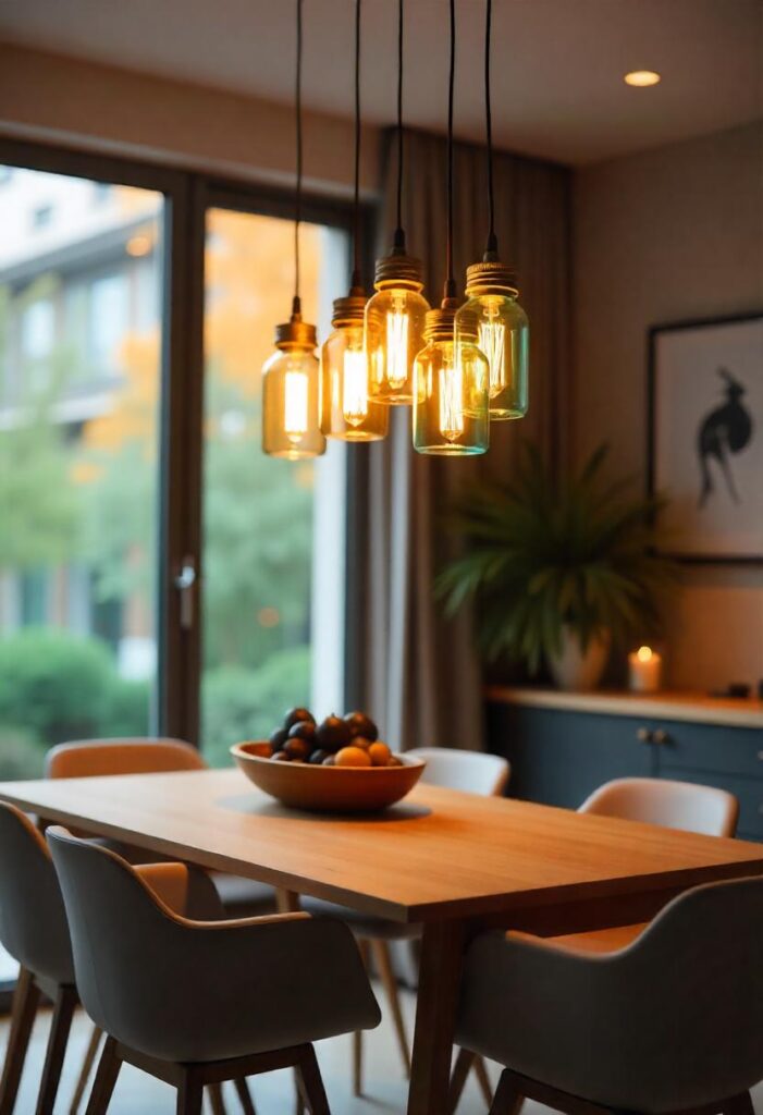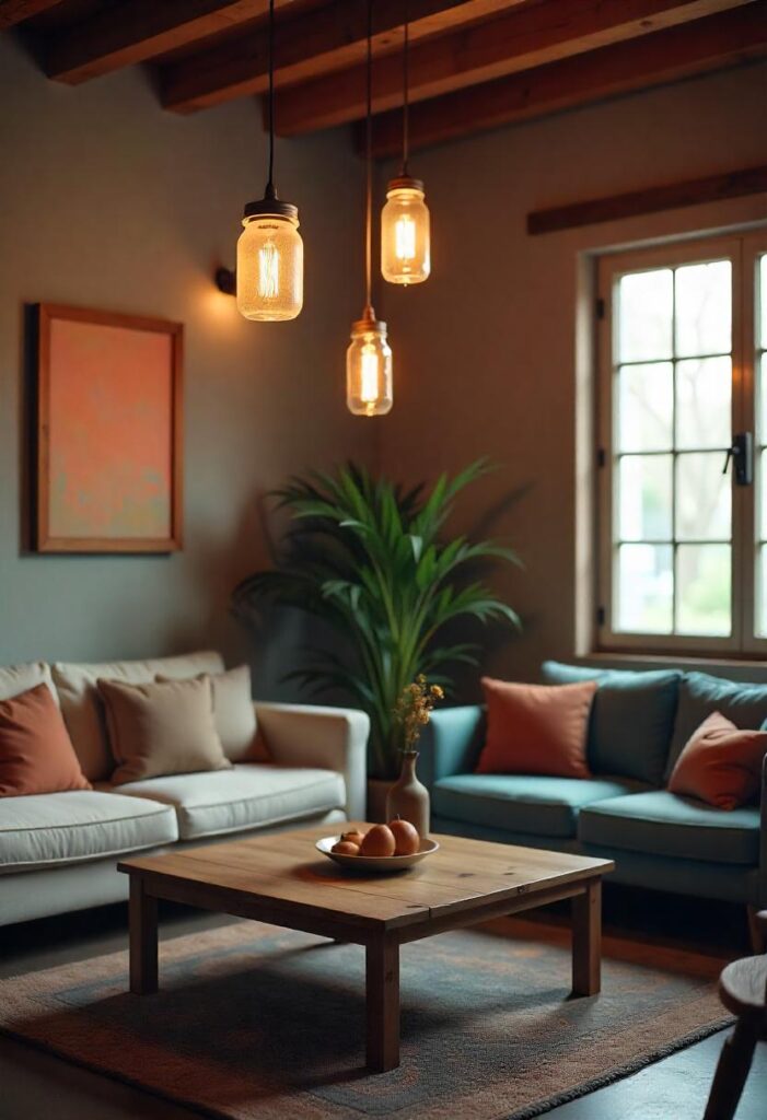 Mason jars can be converted into ceiling-hung light fixtures with basic wiring kits. Use tinted or frosted glass for diffusion and install Edison-style bulbs for visual depth. Hang at varying heights to create interest in grouped designs. Reinforce the necks of jars with metal brackets or collars to handle the bulb weight. These lights fit well above tables or corners. Ensure electrical safety with tested components.