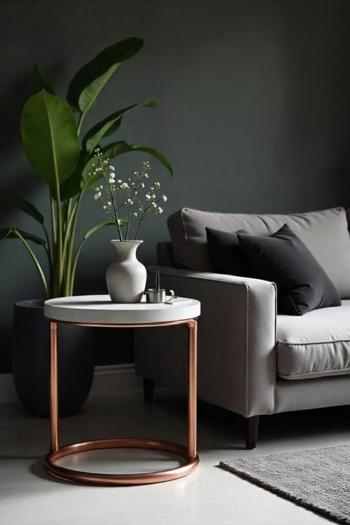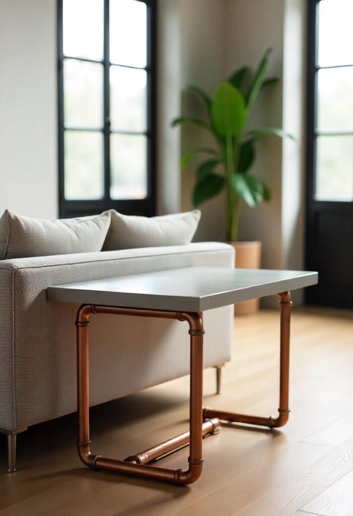 Create sturdy side tables by combining copper pipes with poured concrete tops. Cut and assemble the pipe frame using elbow joints and secure with adhesive. Mix and pour concrete into a round or square mold for the surface. After curing, polish the top and attach it to the base. Use a matte sealant to maintain the raw appearance. Measure proportions carefully to match existing furniture.
